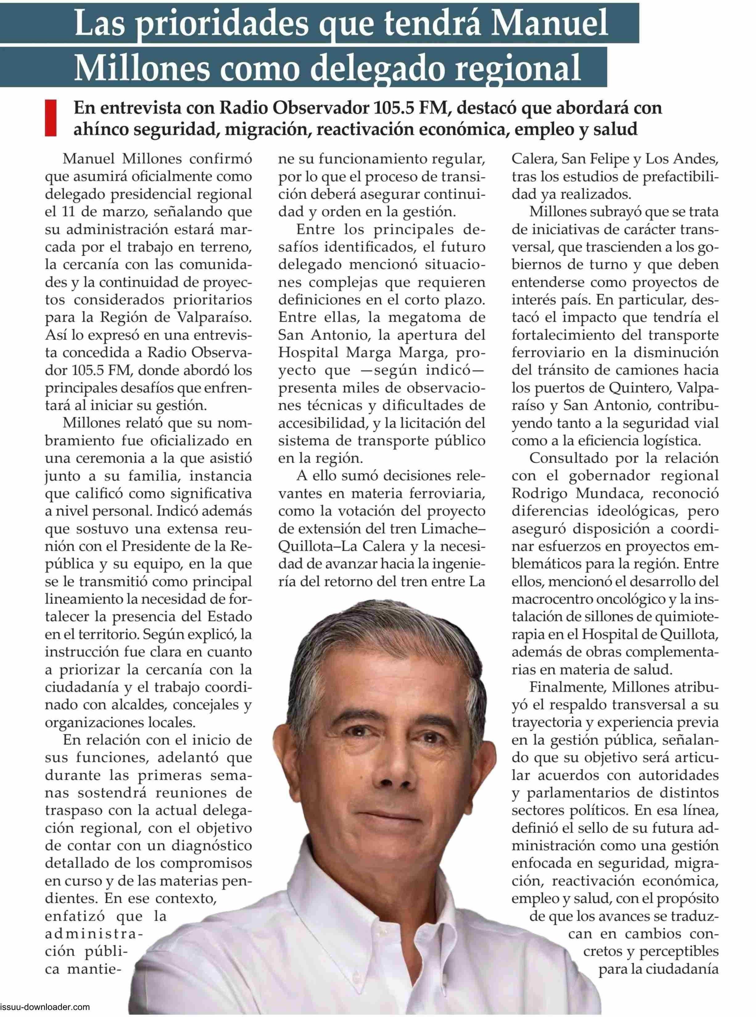 Las prioridades que tendrá Manuel Millones como delegado regional