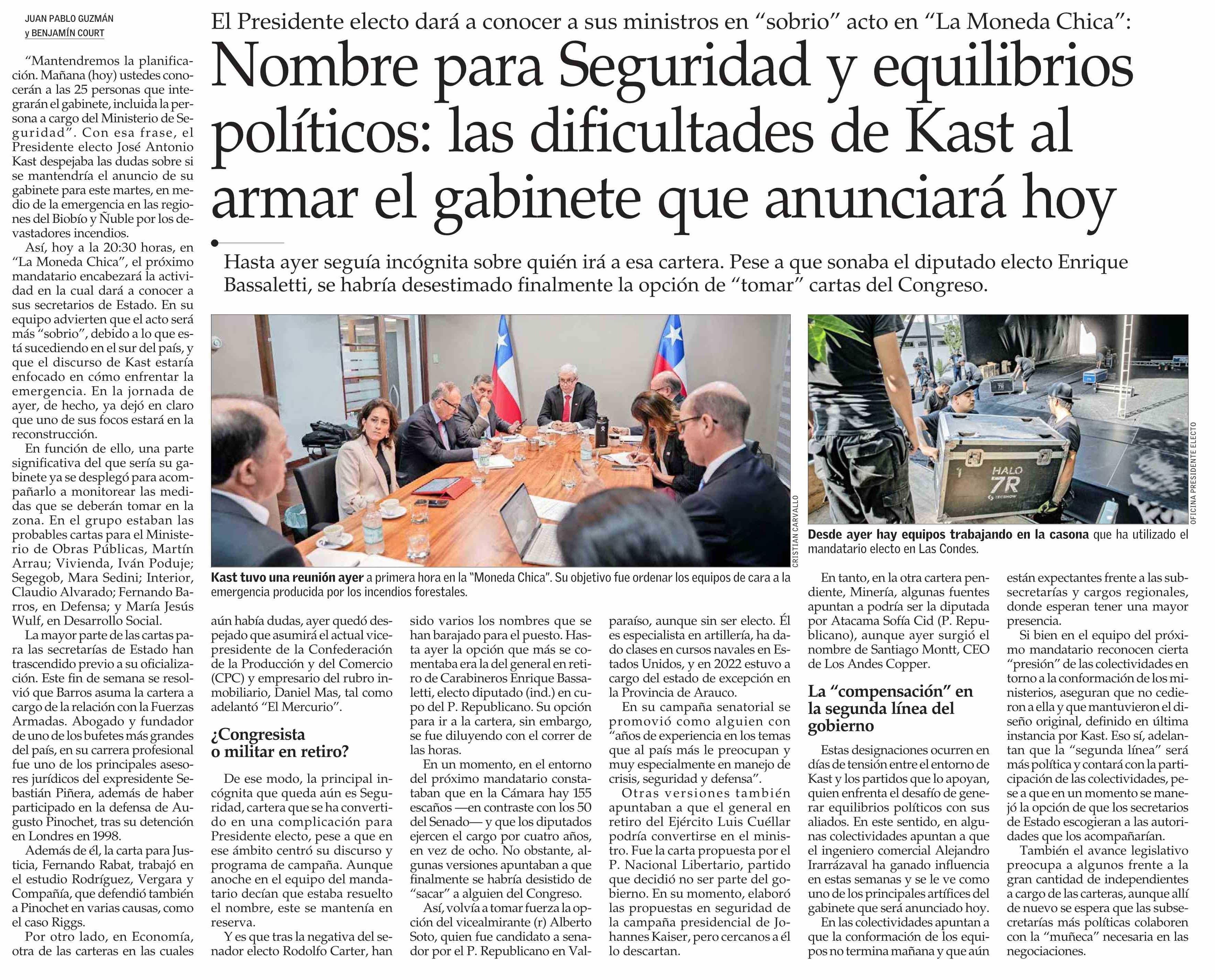 Nombre para Seguridad y equilibrios políticos: las dificultades de Kast al armar el gabinete que anunciará hoy