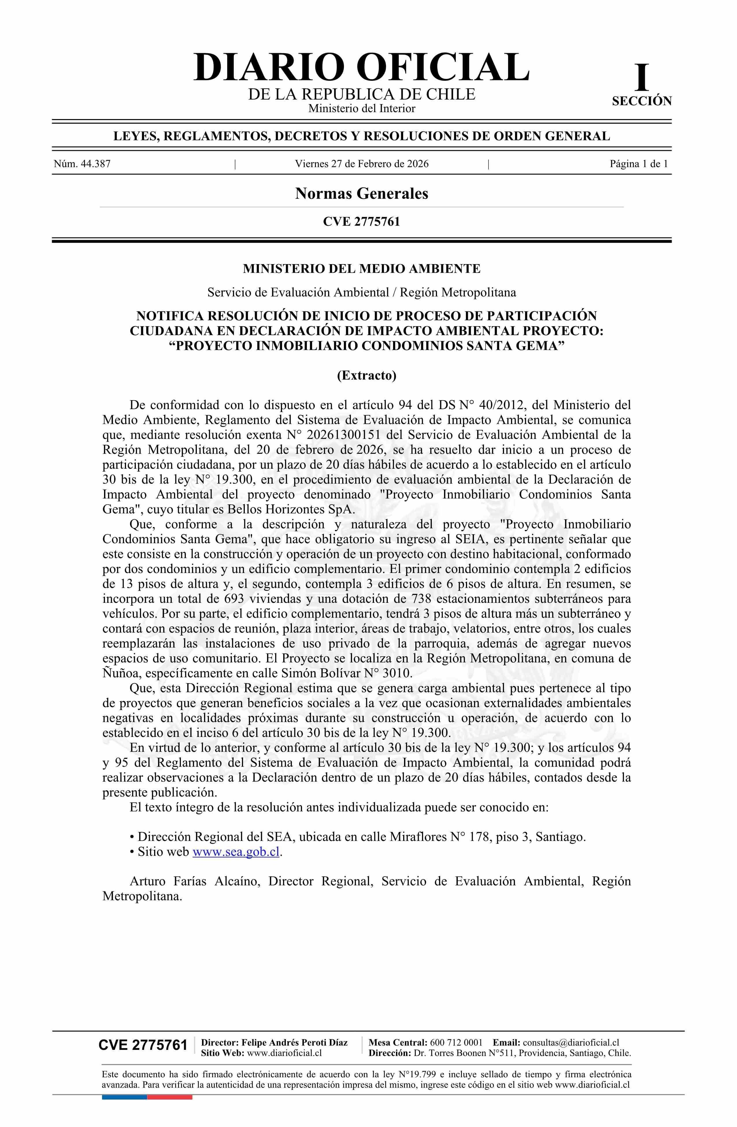 Título: Extracto de resolución exenta número 20261300151, de 2026.- Inicia proceso de participación ciudadana en Declaración de Impacto Ambiental del Proyecto Inmobiliario Condominios Santa Gema