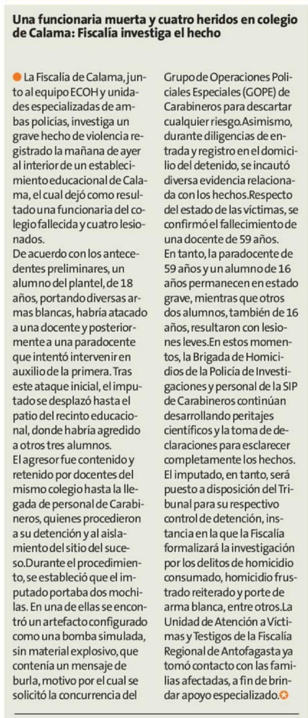 Título: · La Fiscalía de Calama, junto al equipo ECOH y unidades especializadas de ambas policías, investiga un grave hecho de violencia registrado la mañana de ayer al interior de un establecimiento educacional de Calama, el cual dejó como resultado una funcionaria del colegio fallecida y cuatro lesionados