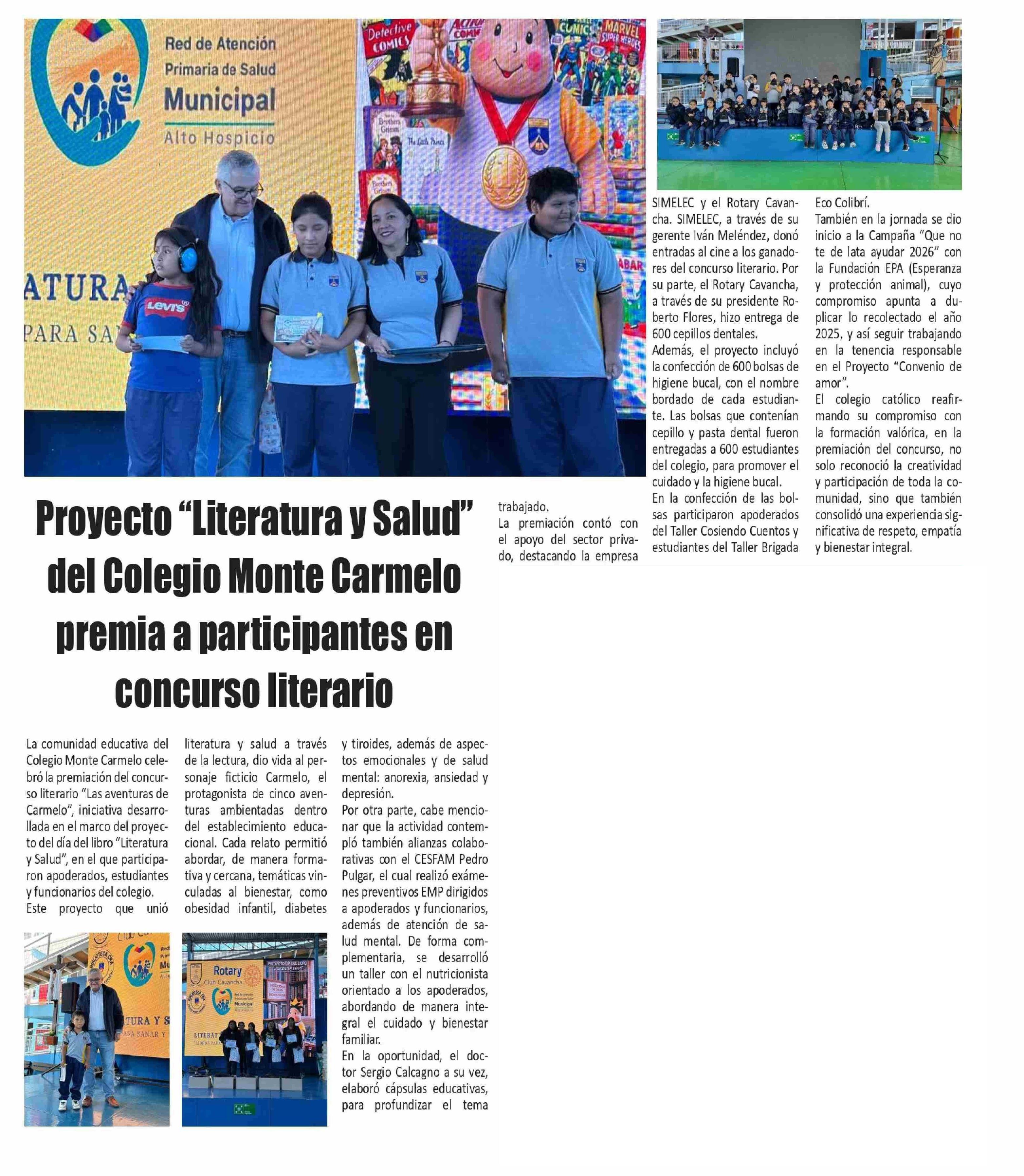 Título: Proyecto “Literatura y Salud" del Colegio Monte Carmelo premia a participantes en concurso literario