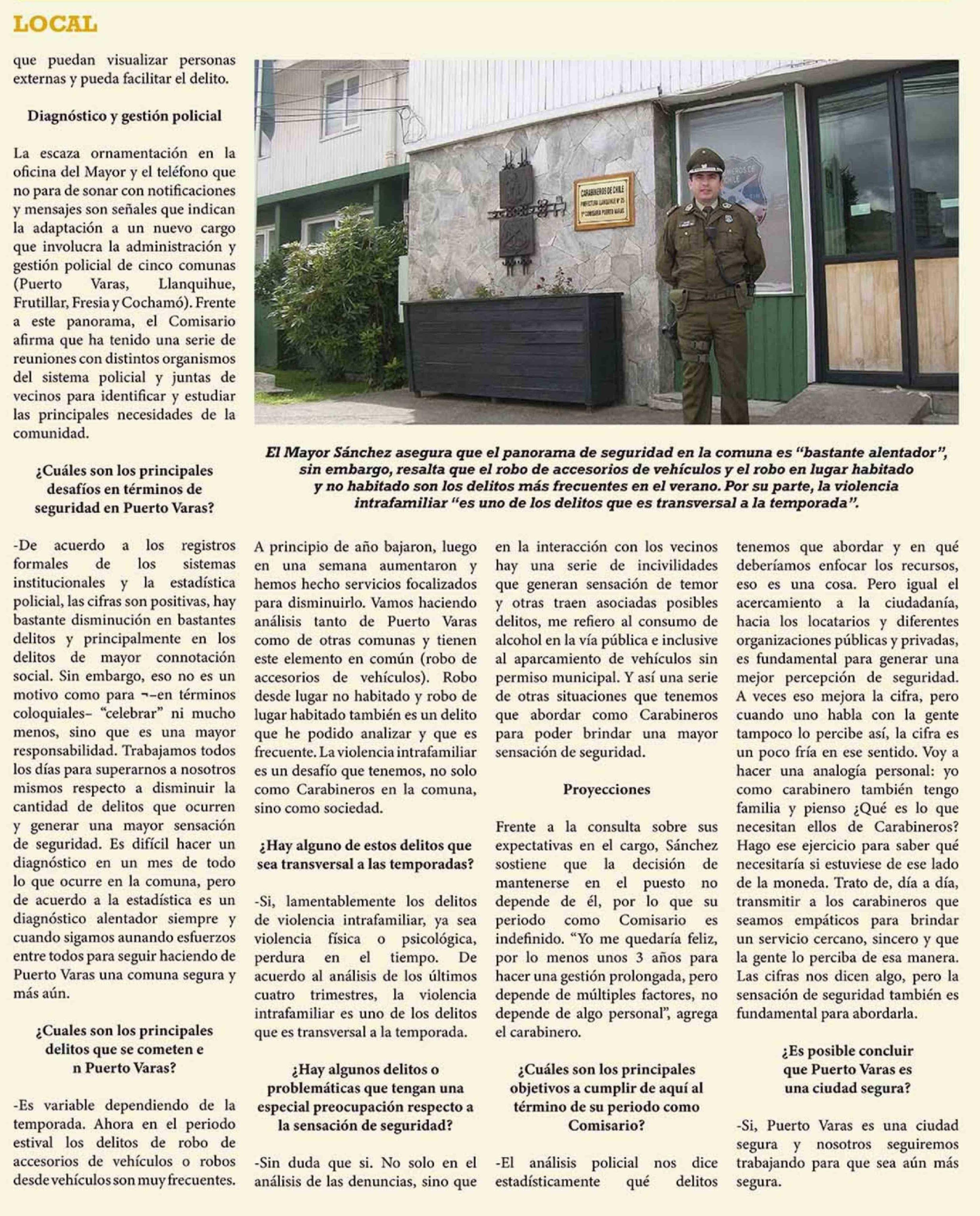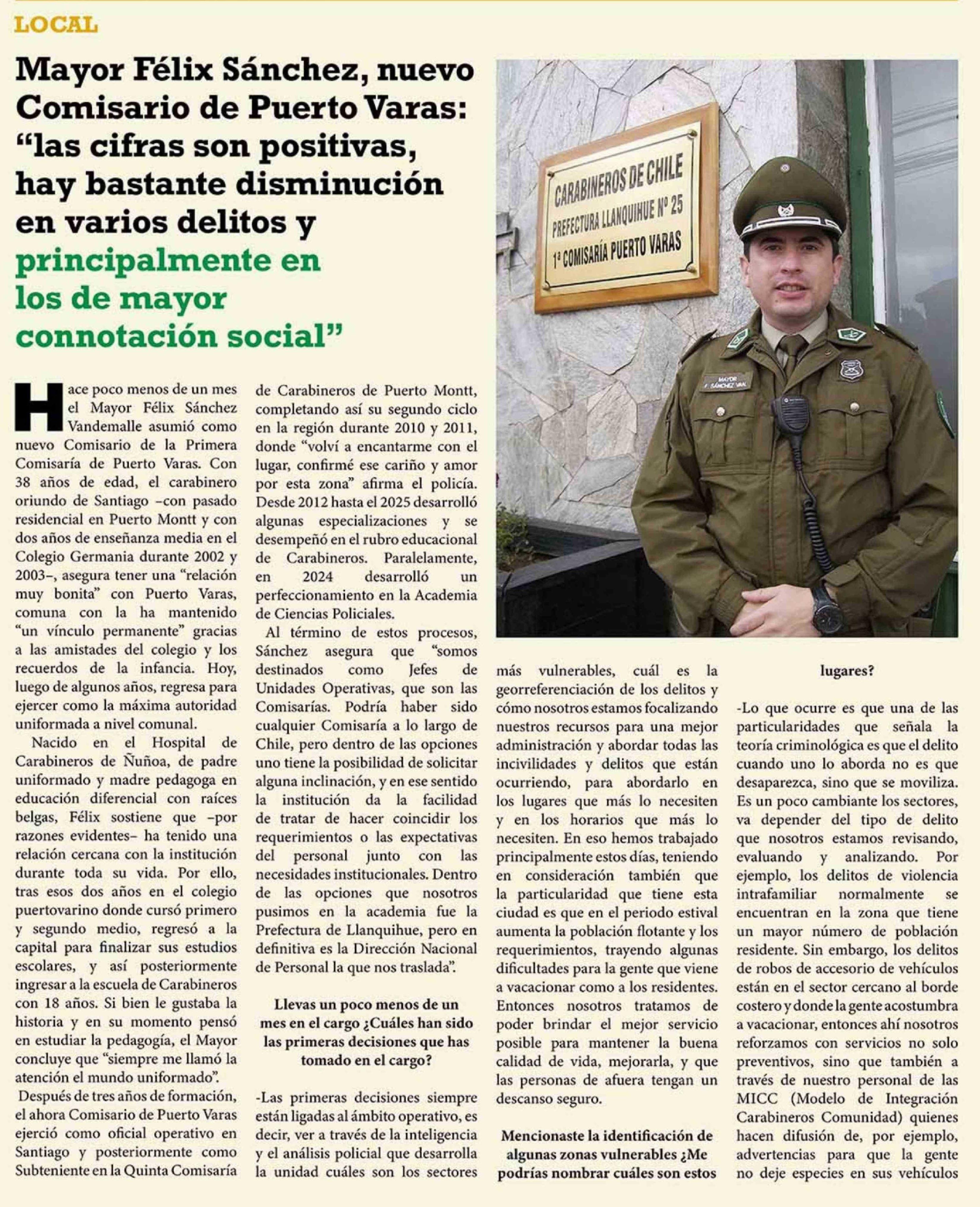 Título: Mayor Félix Sánchez, nuevo Comisario de Puerto Varas: "las cifras son positivas, hay bastante disminución en varios delitos y principalmente en los de mayor connotación social"