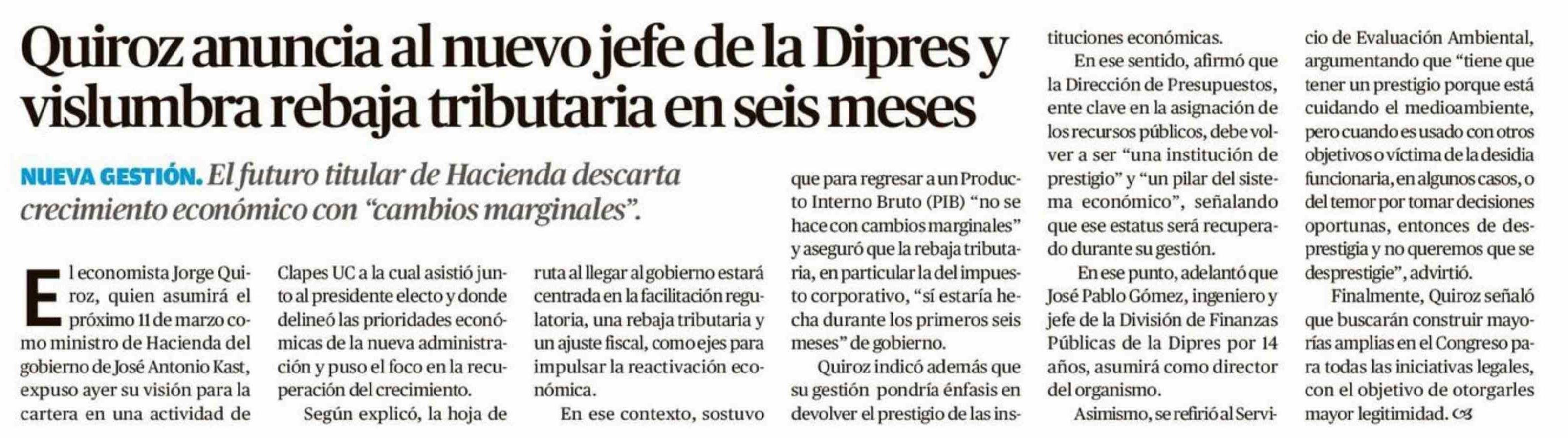 Quiroz anuncia al nuevo jefe de la Dipres y vislumbra rebaja tributaria en seis meses