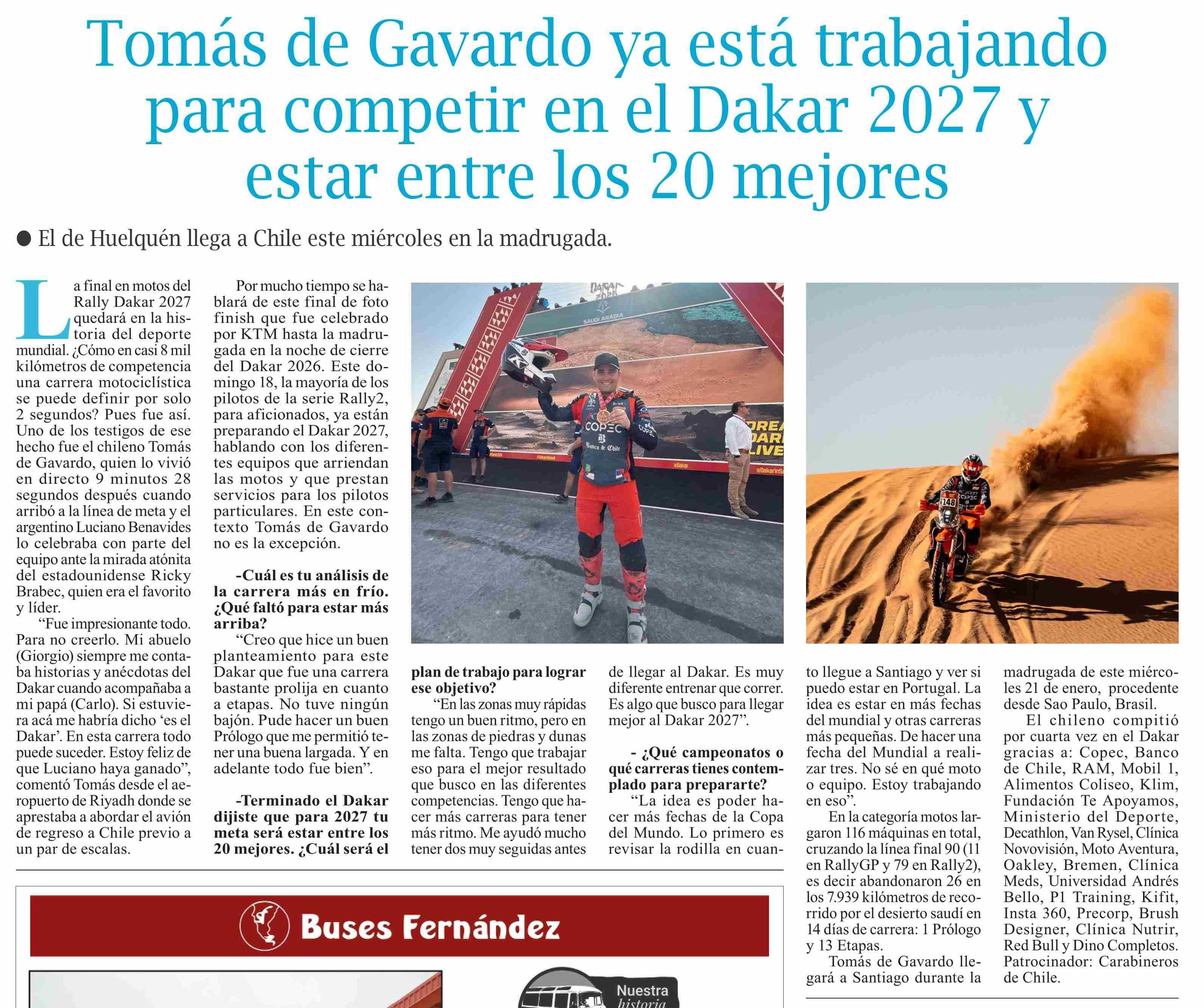 Tomás de Gavardo ya está trabajando para competir en el Dakar 2027 y estar entre los 20 mejores