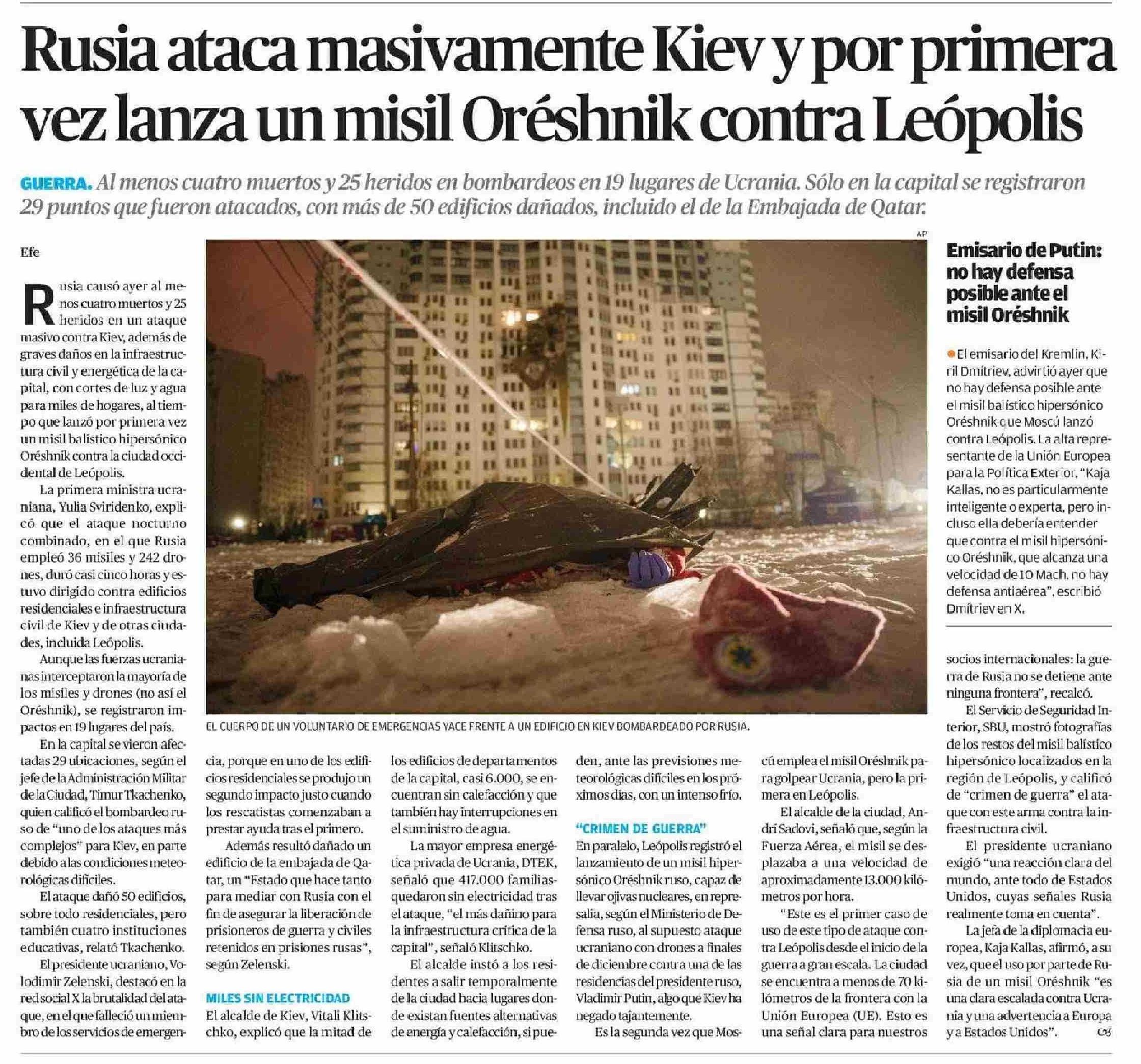 Rusia ataca masivamente Kiev y por primera vez lanza un misil Oréshnik contra Leópolis