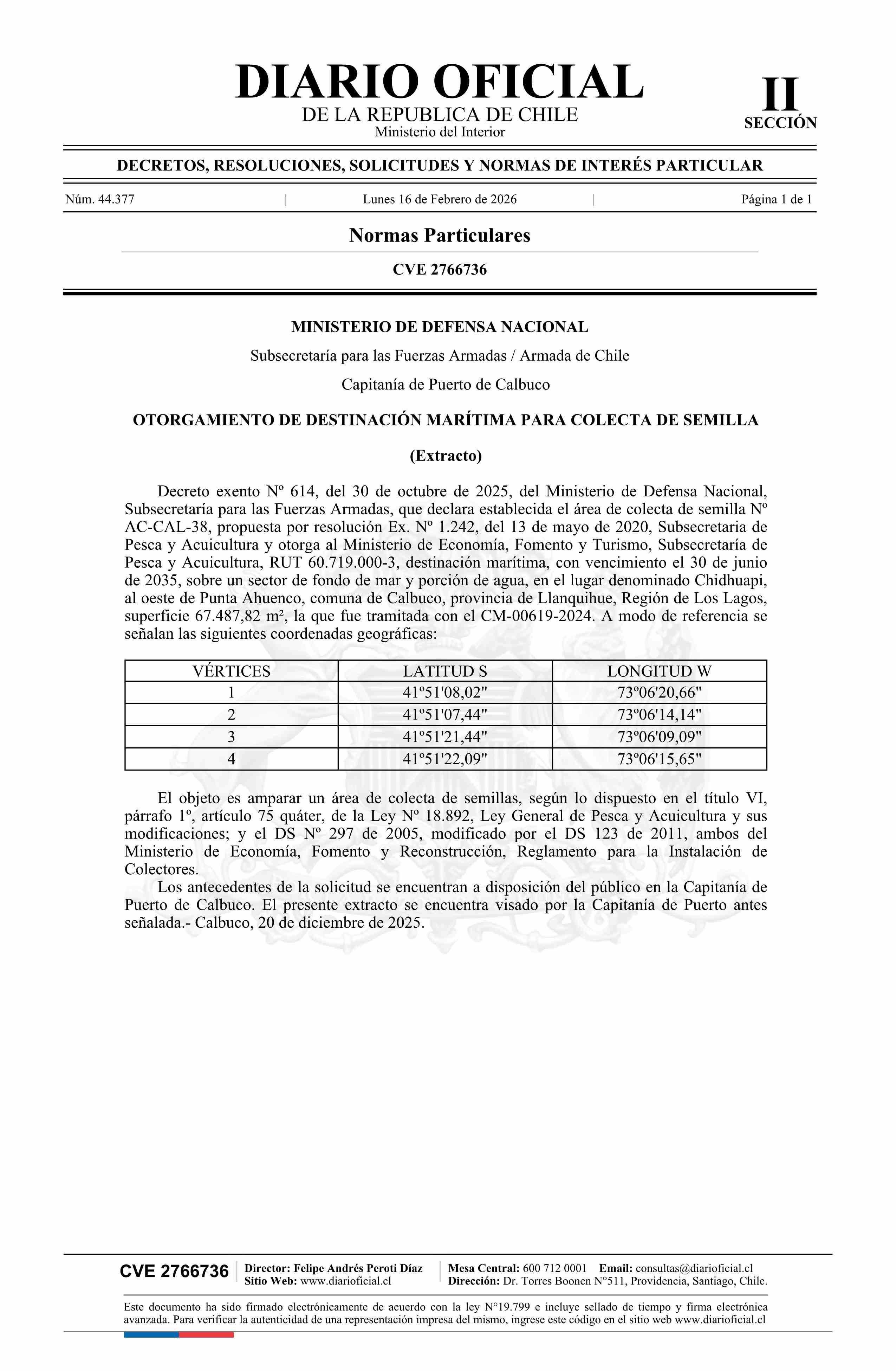 | Título: | Extracto de decreto exento número 614, de 2025.- Otorgamiento de destinación marítima para colecta de semilla |
