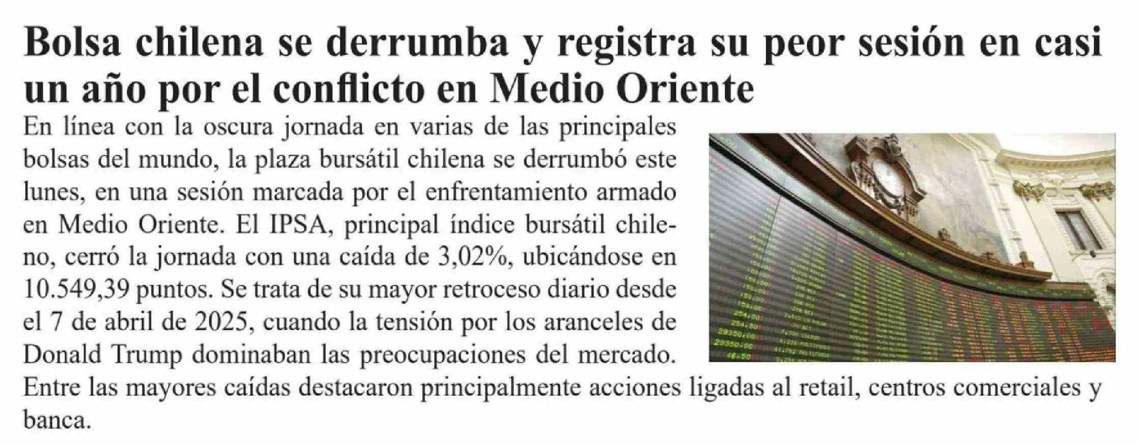Bolsa chilena se derrumba y registra su peor sesión en casi un año por el conflicto en Medio Oriente