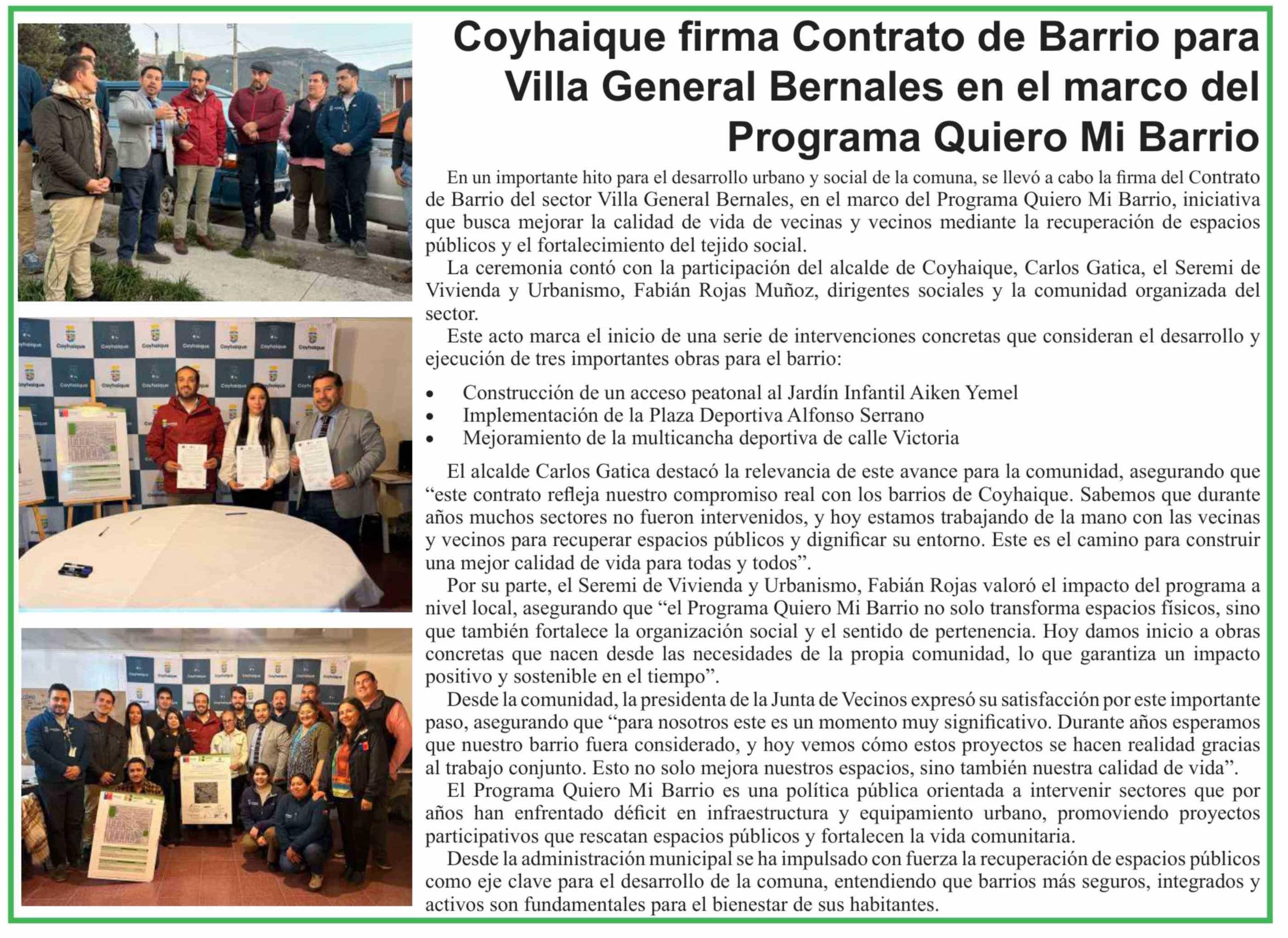 Coyhaique firma Contrato de Barrio para Villa General Bernales en el marco del Programa Quiero Mi Barrio