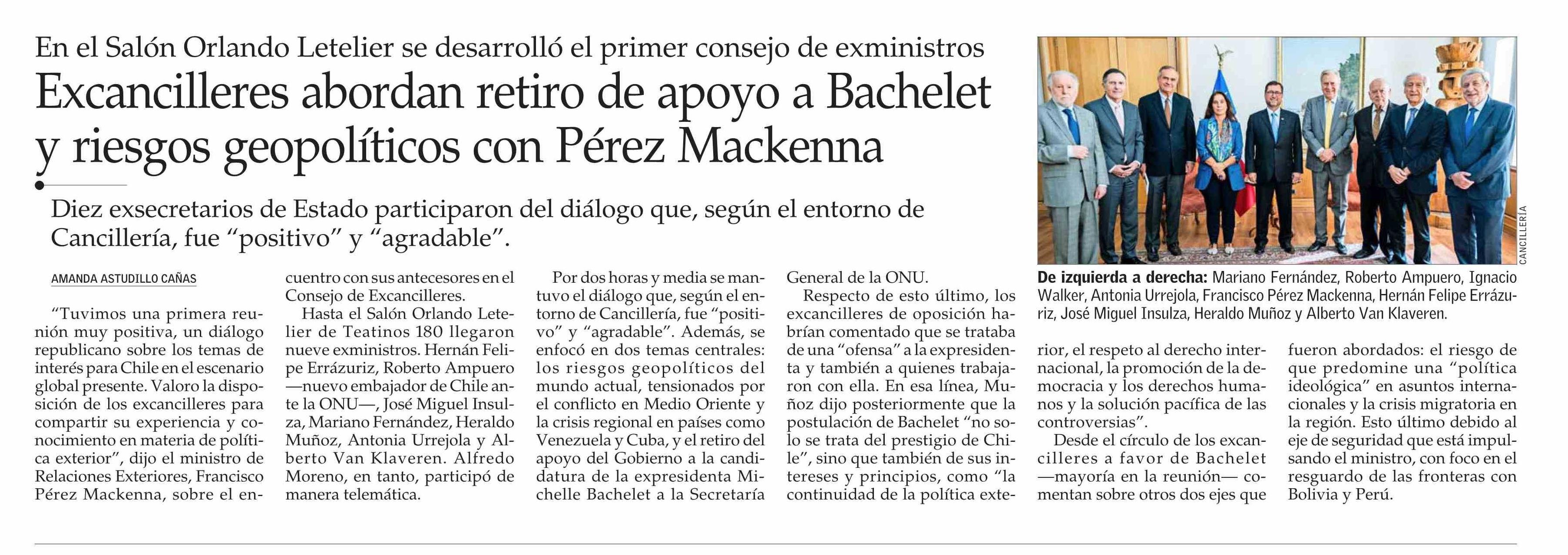 Excancilleres abordan retiro de apoyo a Bachelet y riesgos geopolíticos con Pérez Mackenna