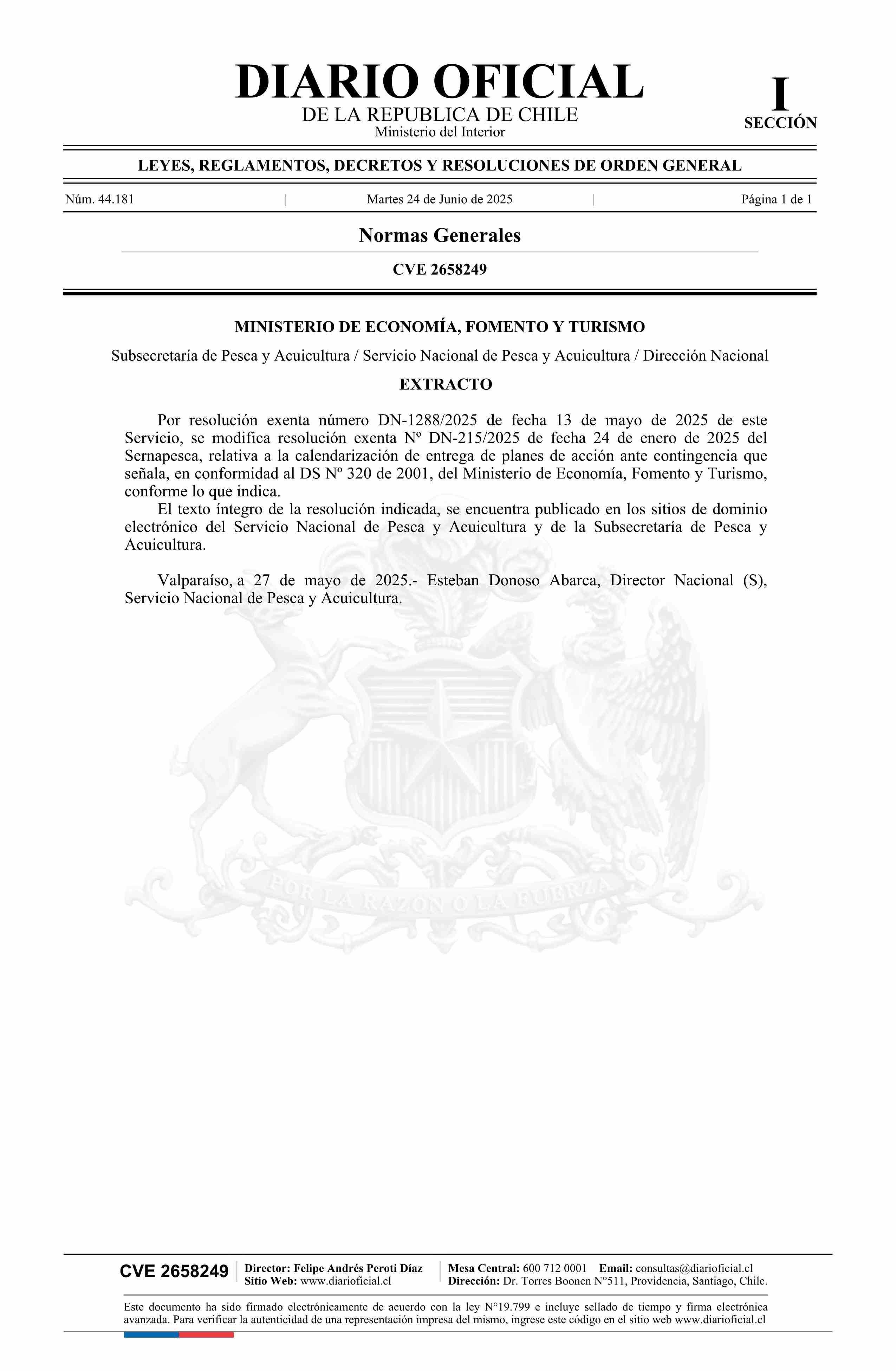 | Título: | Extracto de resolución exenta número DN-1288/2025, de 2025.- Modifica resolución N° DN-215/2025 exenta, de 2025 |