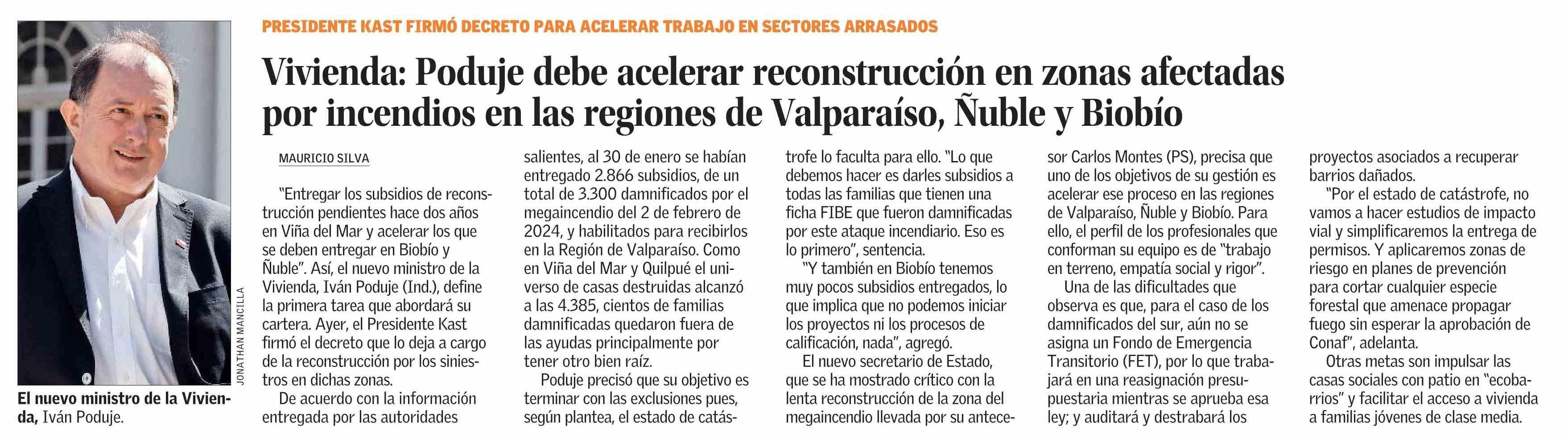 Vivienda: Poduje debe acelerar reconstrucción en zonas afectadas por incendios en las regiones de Valparaíso, Ñuble y Biobío