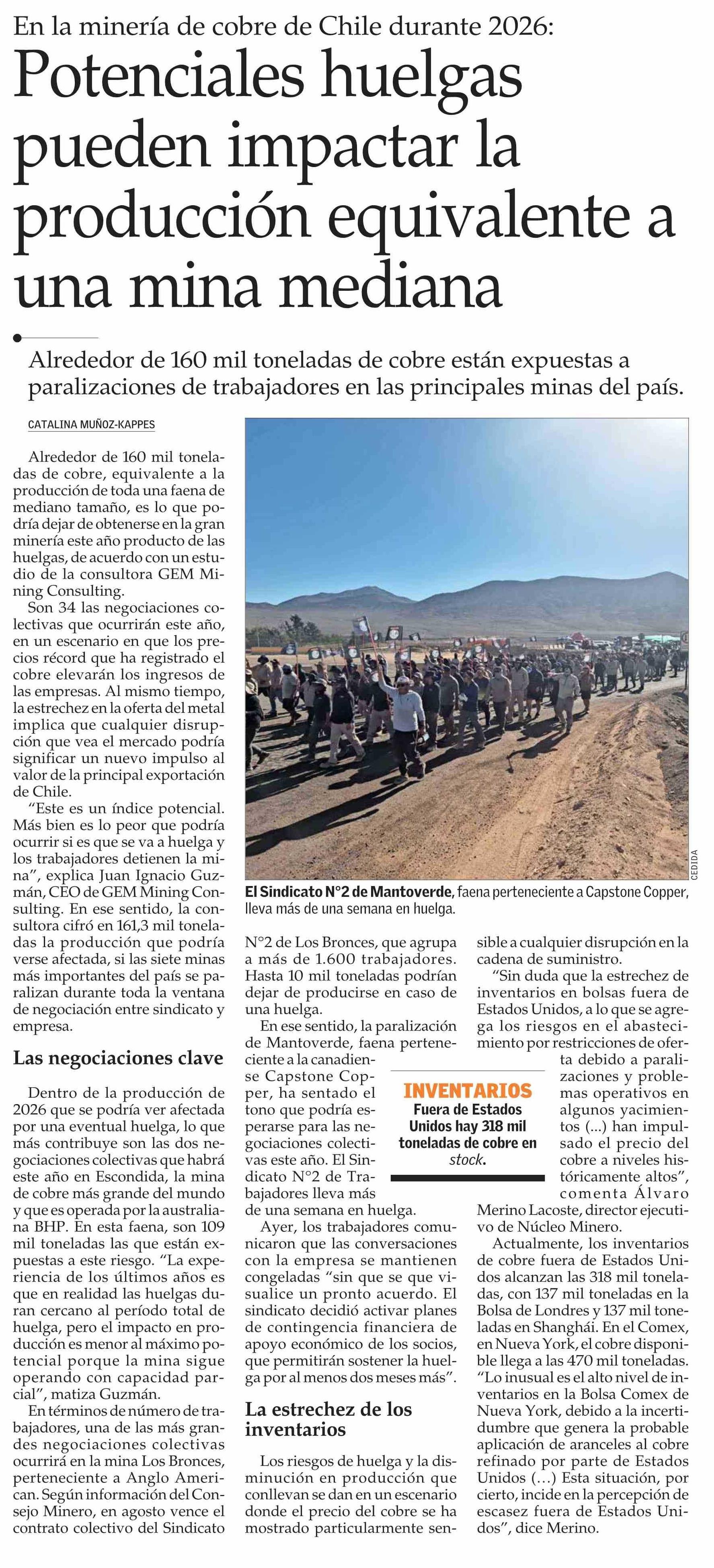 Potenciales huelgas pueden impactar la producción equivalente a una mina mediana