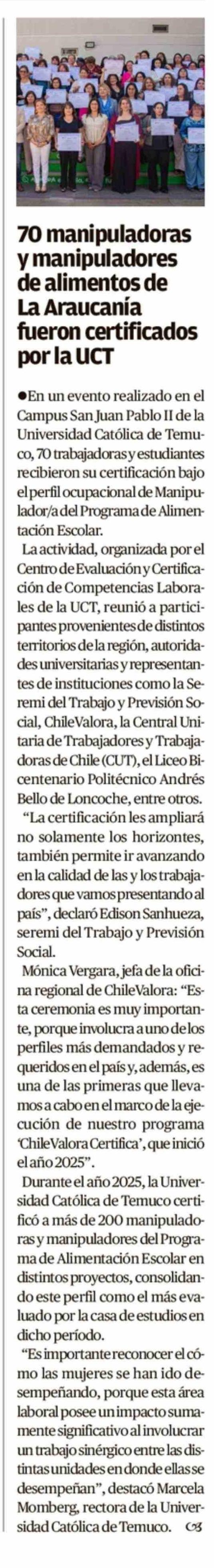 70 Manipuladoras y manipuladores de alimentos de La Araucania fueron certificados por la UCT