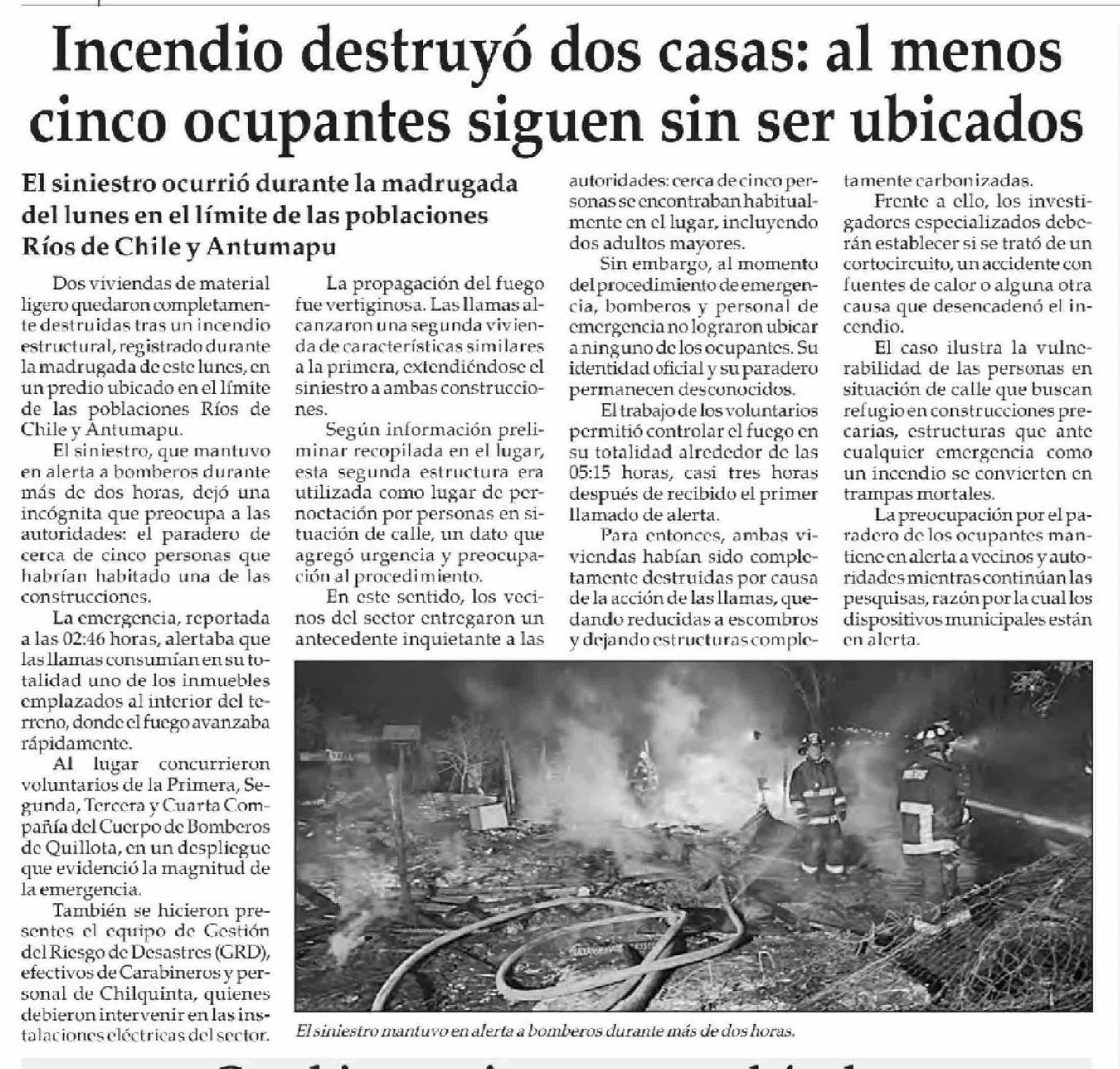 Incendio destruyó dos casas: al menos cinco ocupantes siguen sin ser ubicados