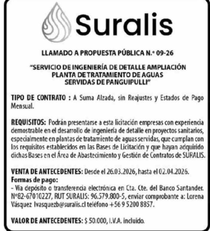 Título: Aviso Licitaciones: LLAMADO A PROPUESTA PÚBLICA N.º 09-26 "SERVICIO DE INGENIERÍA DE DETALLE AMPLIACIÓN PLANTA DE TRATAMIENTO DE AGUAS SERVIDAS DE PANGUIPULLI" TIPO DE CONTRATO : A Suma Alzada, sin Reajustes y Estados de Pago Mensual. REQUISITOS: Podrán presentarse a esta licitación empresas con exp