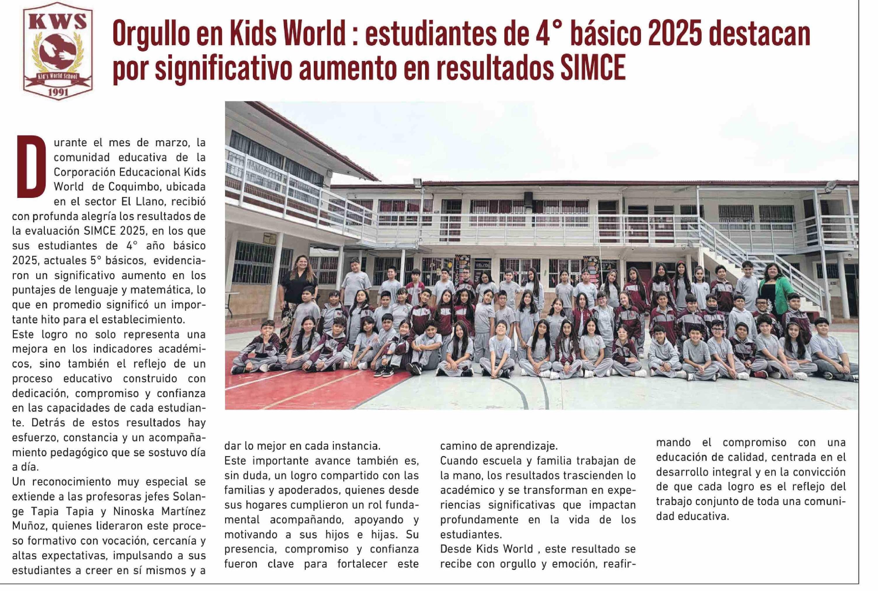 Orgullo en Kids World : estudiantes de 4° básico 2025 destacan por significativo aumento en resultados SIMCE