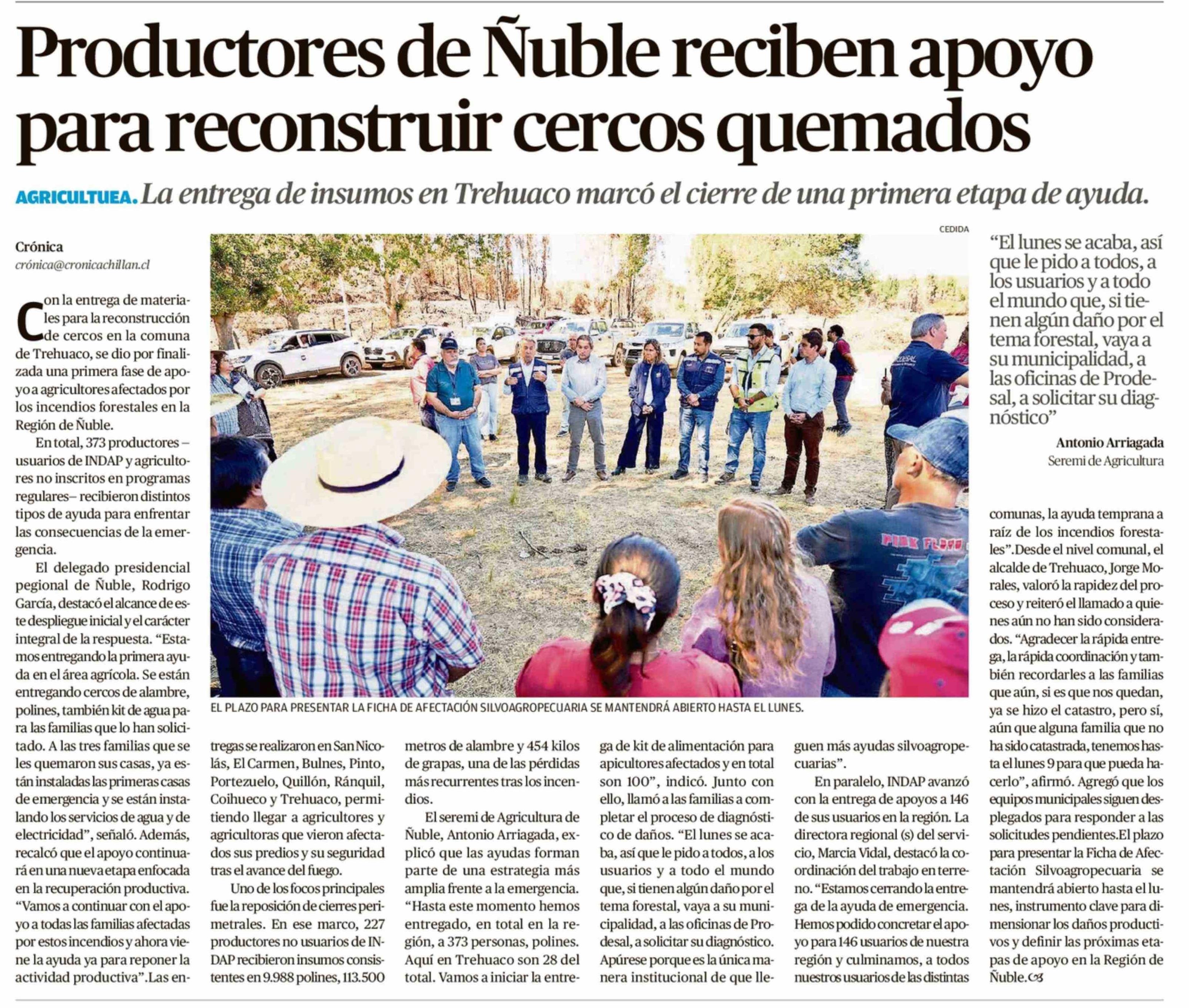 Productores de Nuble reciben apoyo para reconstruir cercos quemados