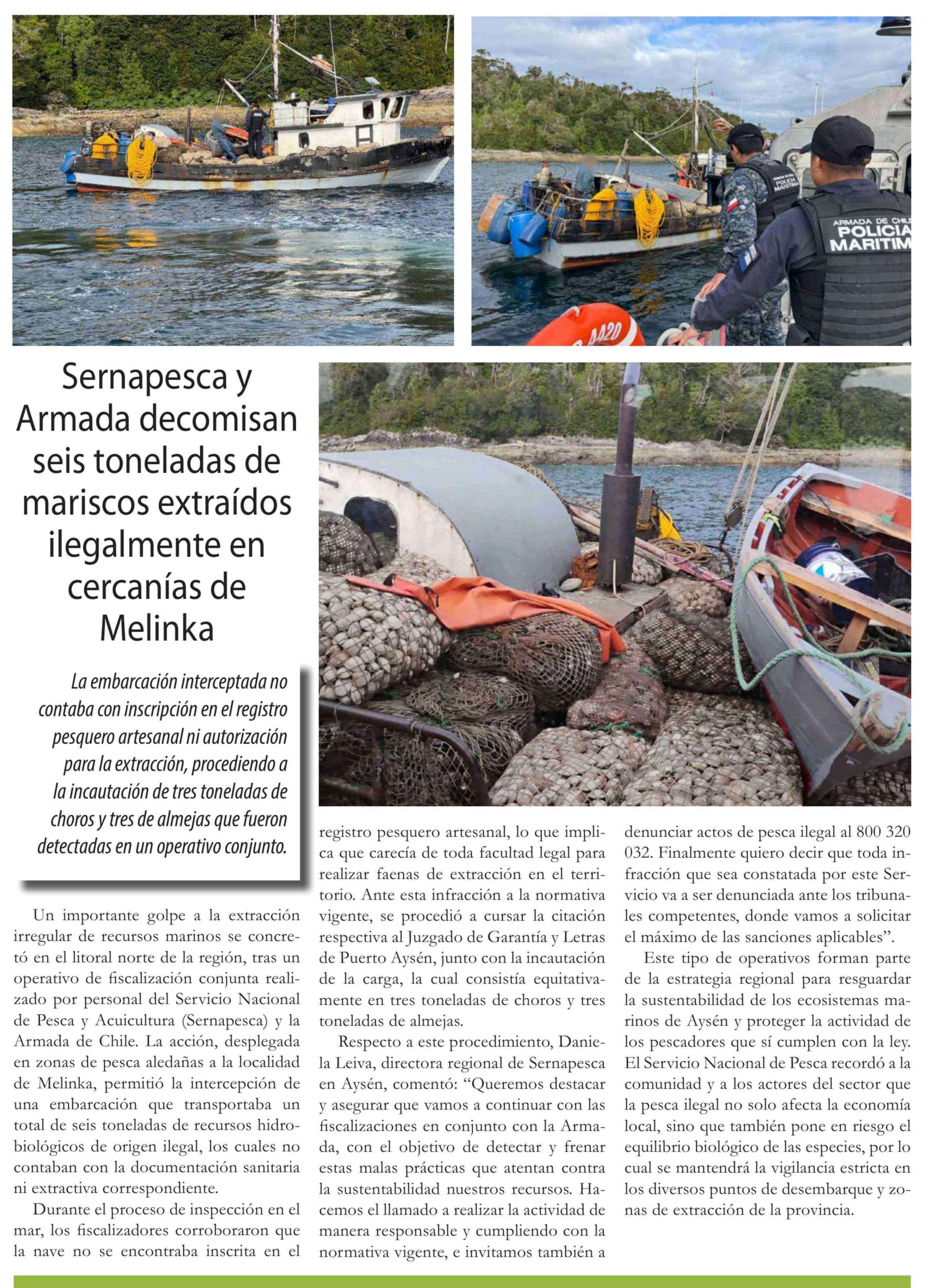 Sernapesca y Armada decomisan seis toneladas de mariscos extraídos ilegalmente en cercanías de Melinka