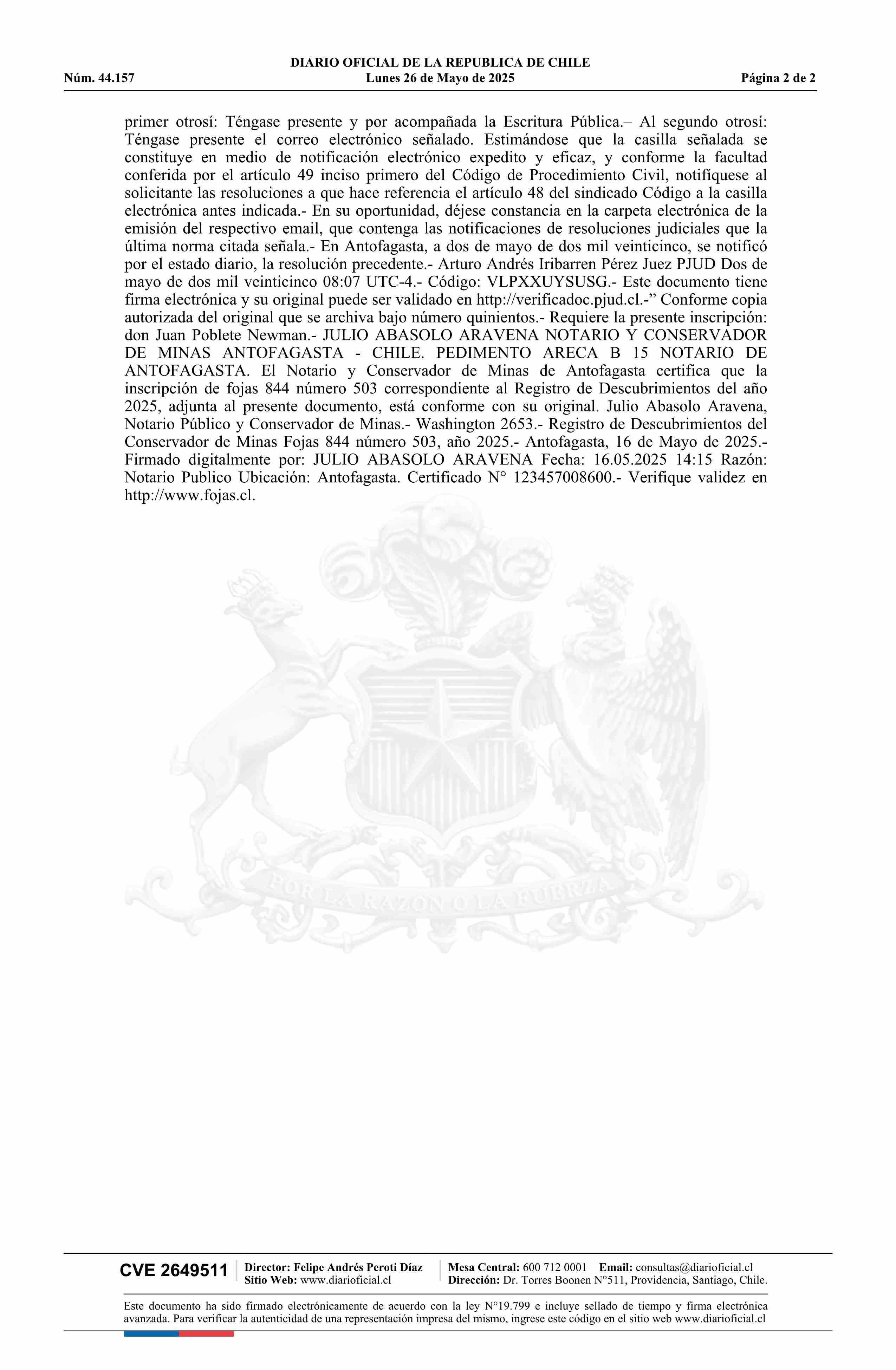 DIARIO OFICIAL CHILE - BOLETÍN OFICIAL DE MINERÍA (DIARIO OFICIAL CHILE – BOM – PEDIMENTOS MINEROS)