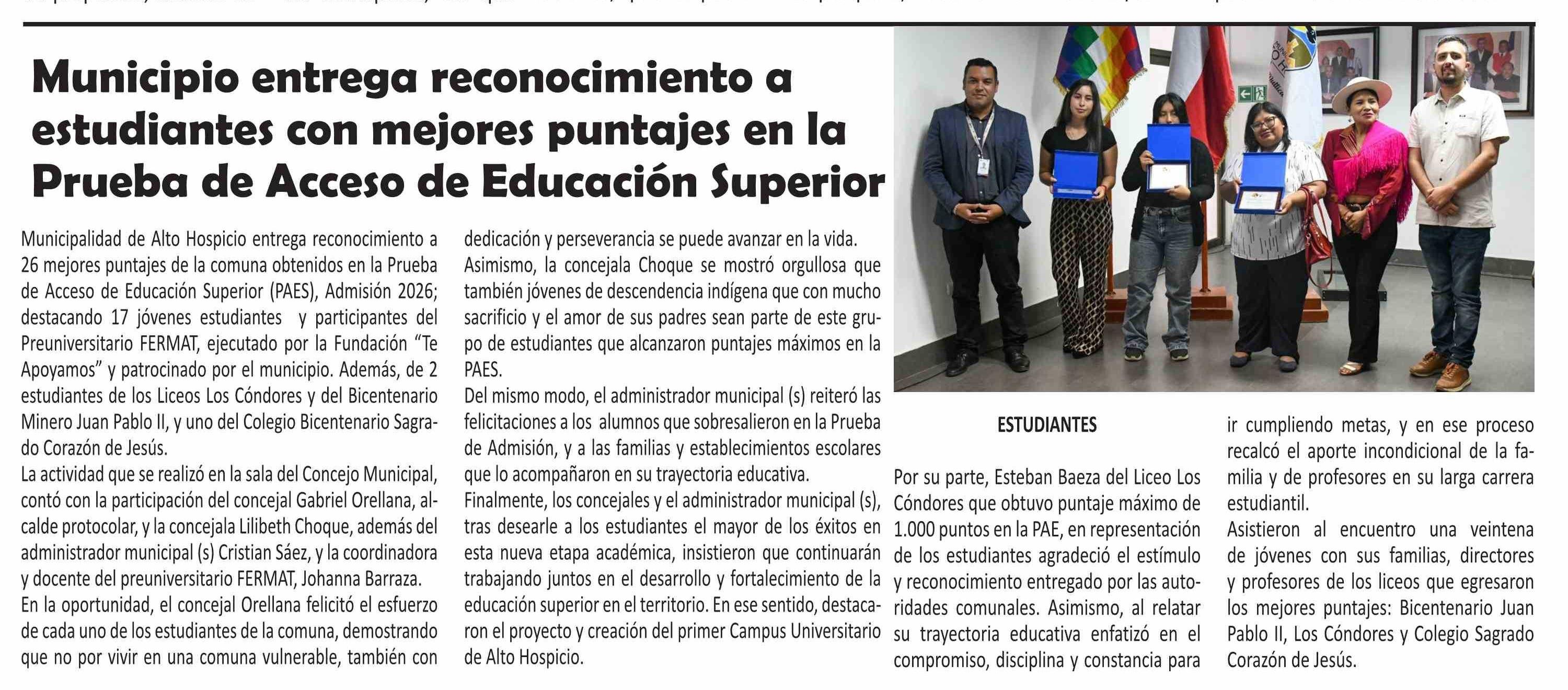 Municipio entrega reconocimiento a estudiantes con mejores puntajes en la Prueba de Acceso de Educación Superior
