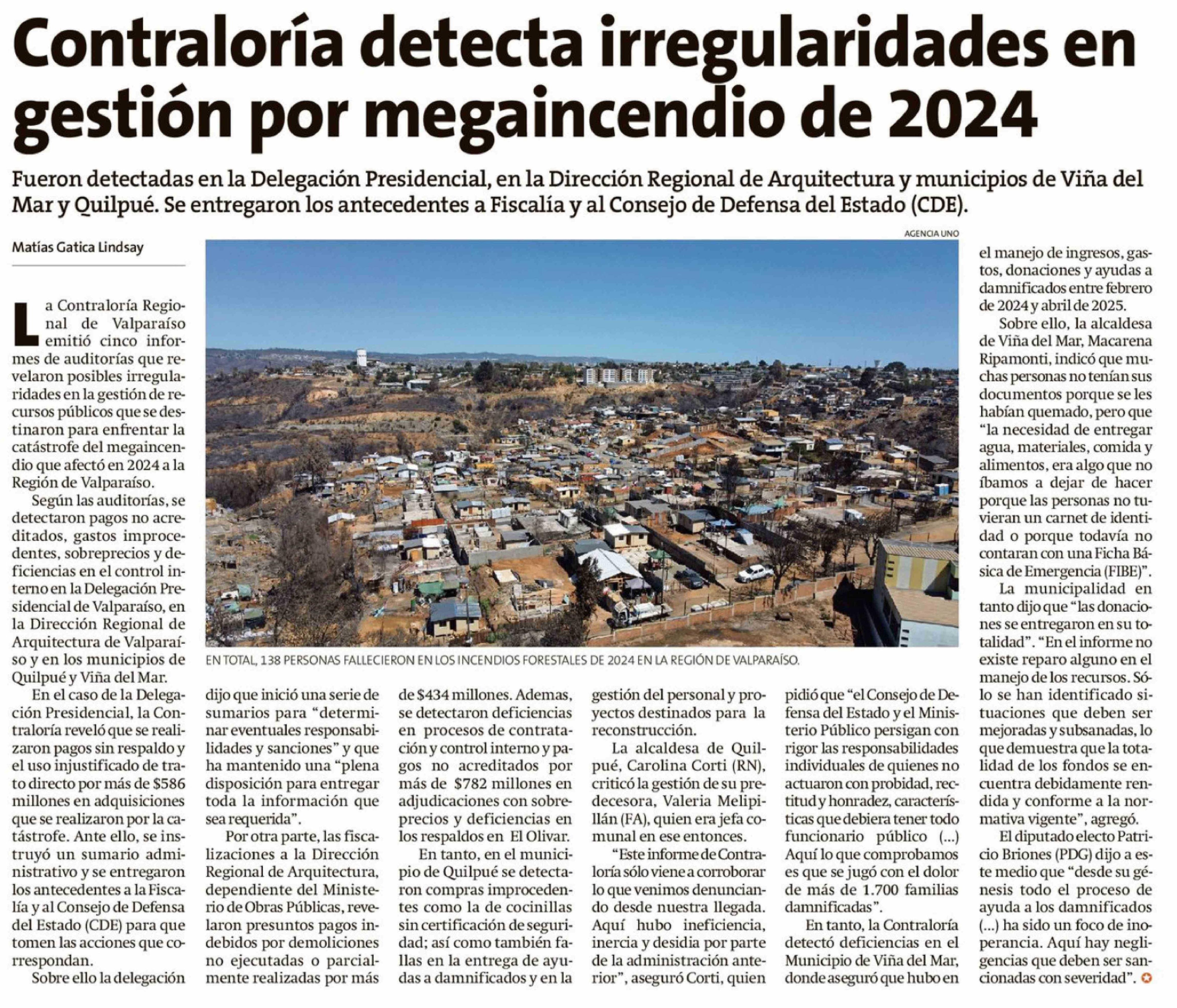 Contraloría detecta irregularidades en gestión por megaincendio de 2024