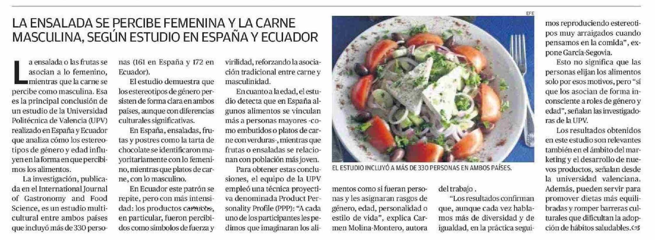 LA ENSALADA SE PERCIBE FEMENINA Y LA CARNE MASCULINA, SEGÚN ESTUDIO EN ESPAÑA Y ECUADOR