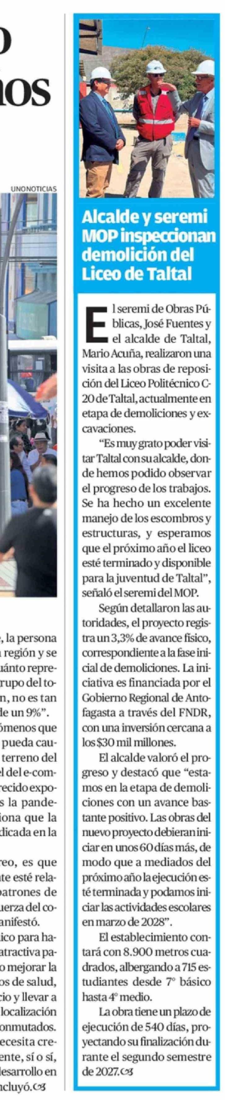 Alcalde y seremi MOP inspeccionan demolición del Liceo de Taltal