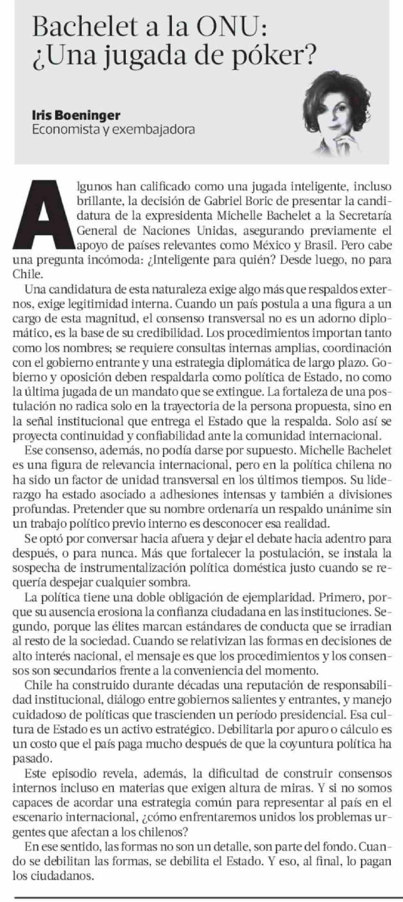 Columnas de Opinión: Bachelet a la ONU: ¿Una jugada de póker?