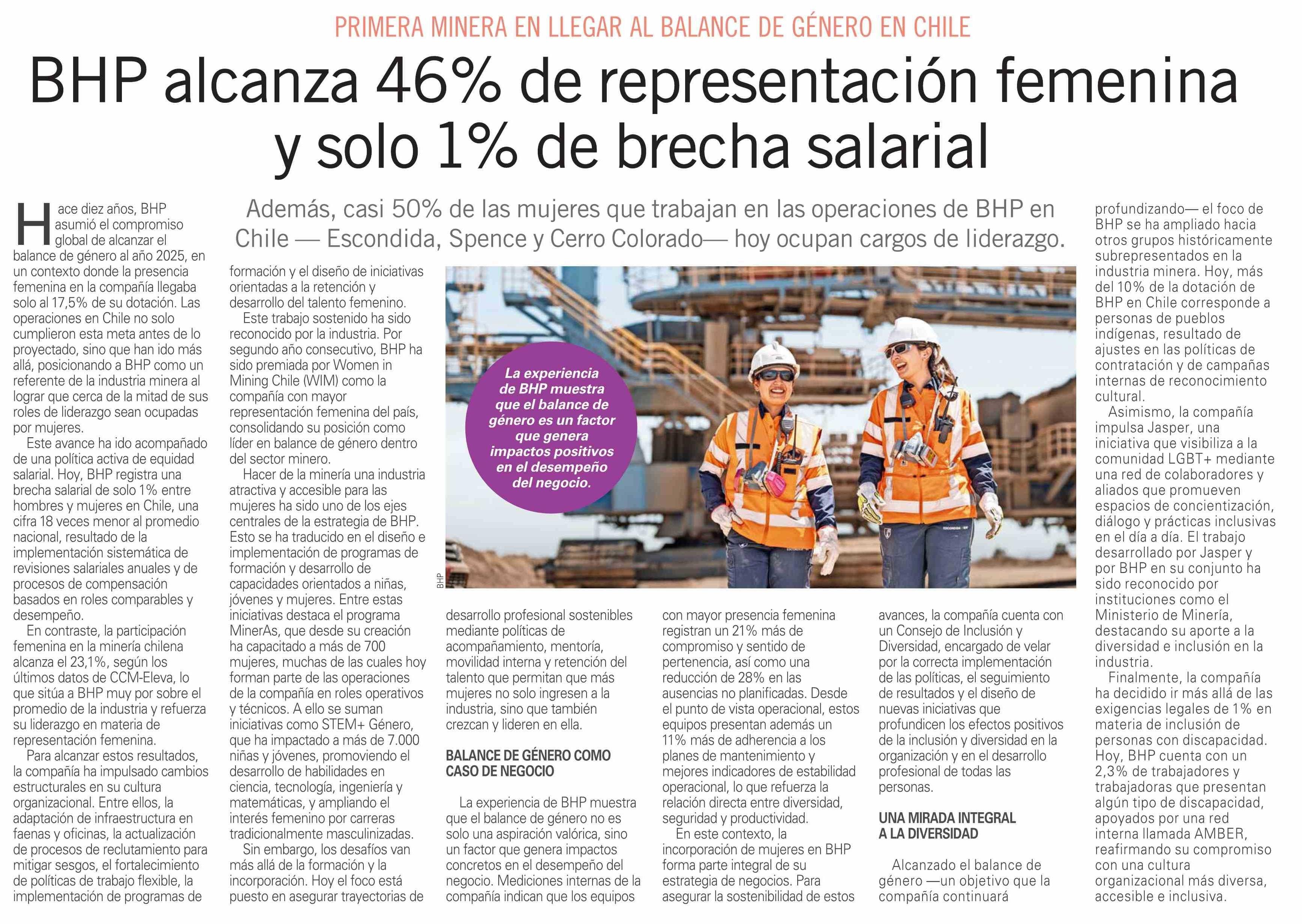 BHP alcanza 46% de representación femenina y solo 1% de brecha salarial