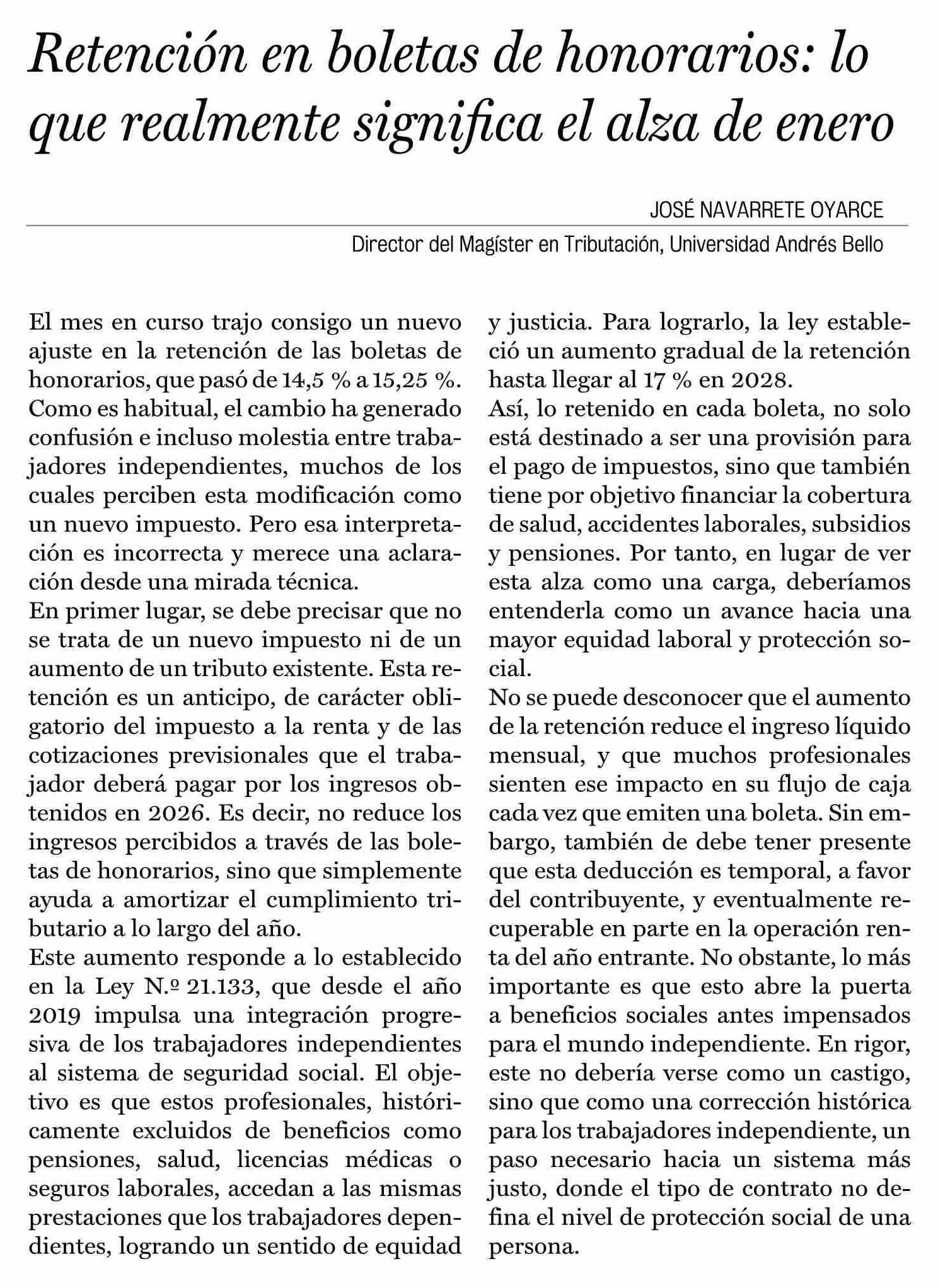 Columnas de Opinión: Retención en boletas de honorarios: lo que realmente significa el alza de enero