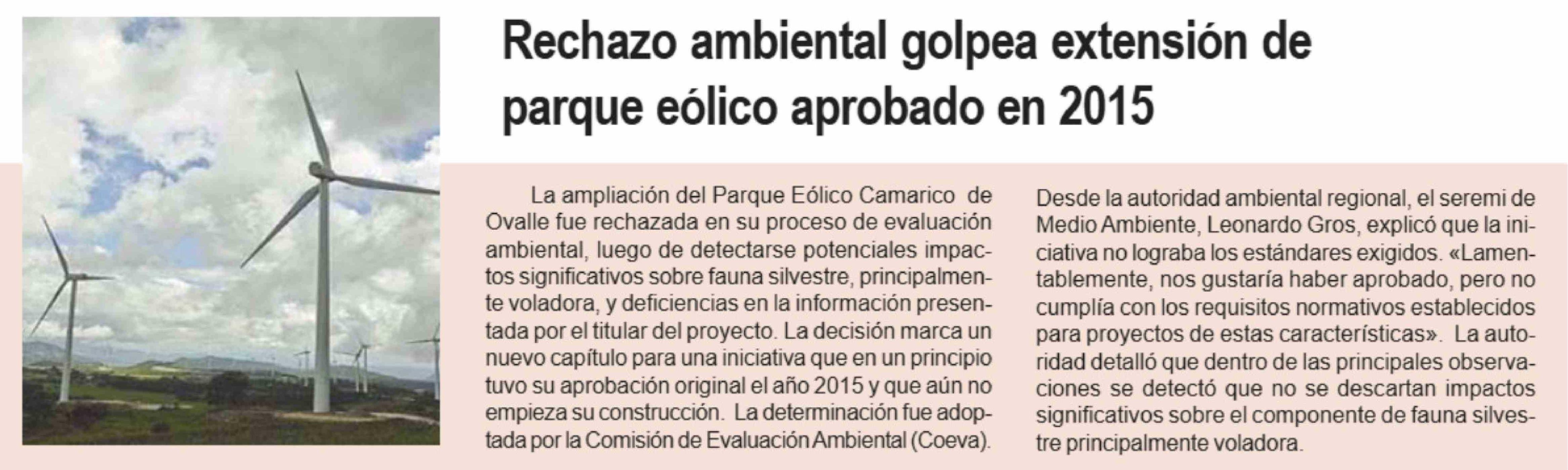 Rechazo ambiental golpea extensión de parque eólico aprobado en 2015