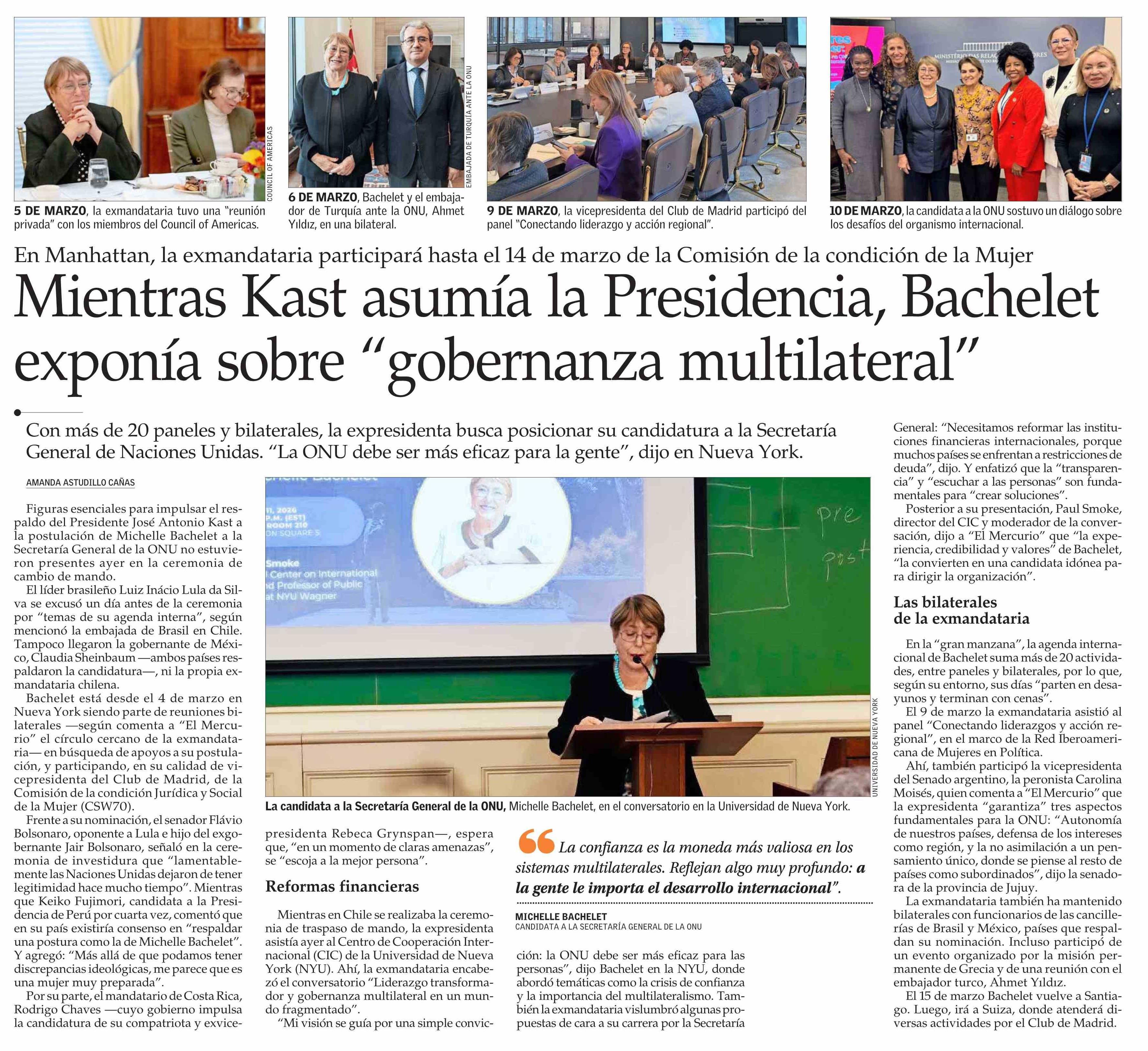 Mientras Kast asumía la Presidencia, Bachelet exponía sobre “gobernanza multilateral”