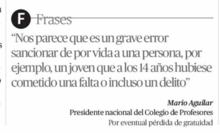 | Título: | Frases "Nos parece que es un grave error sancionar de por vida a una persona, por ejemplo, un joven que a los 14 años hubiese cometido una falta o incluso un delito" |
