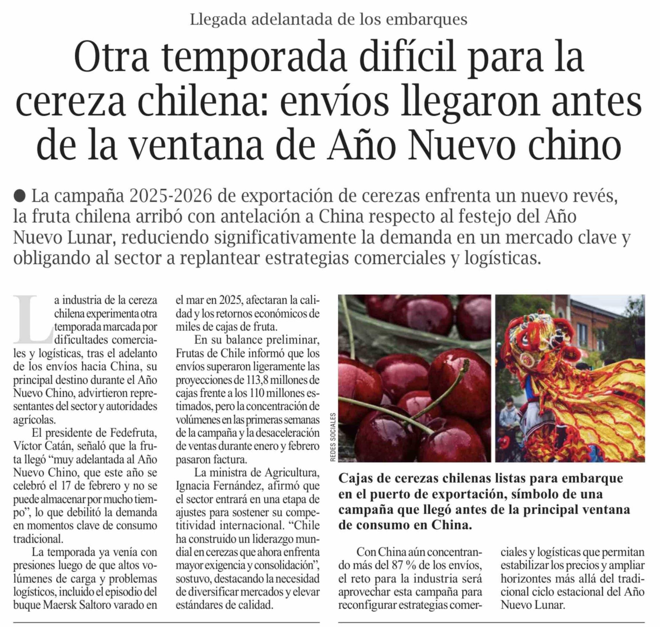 Otra temporada difícil para la cereza chilena: envíos llegaron antes de la ventana de Año Nuevo chino