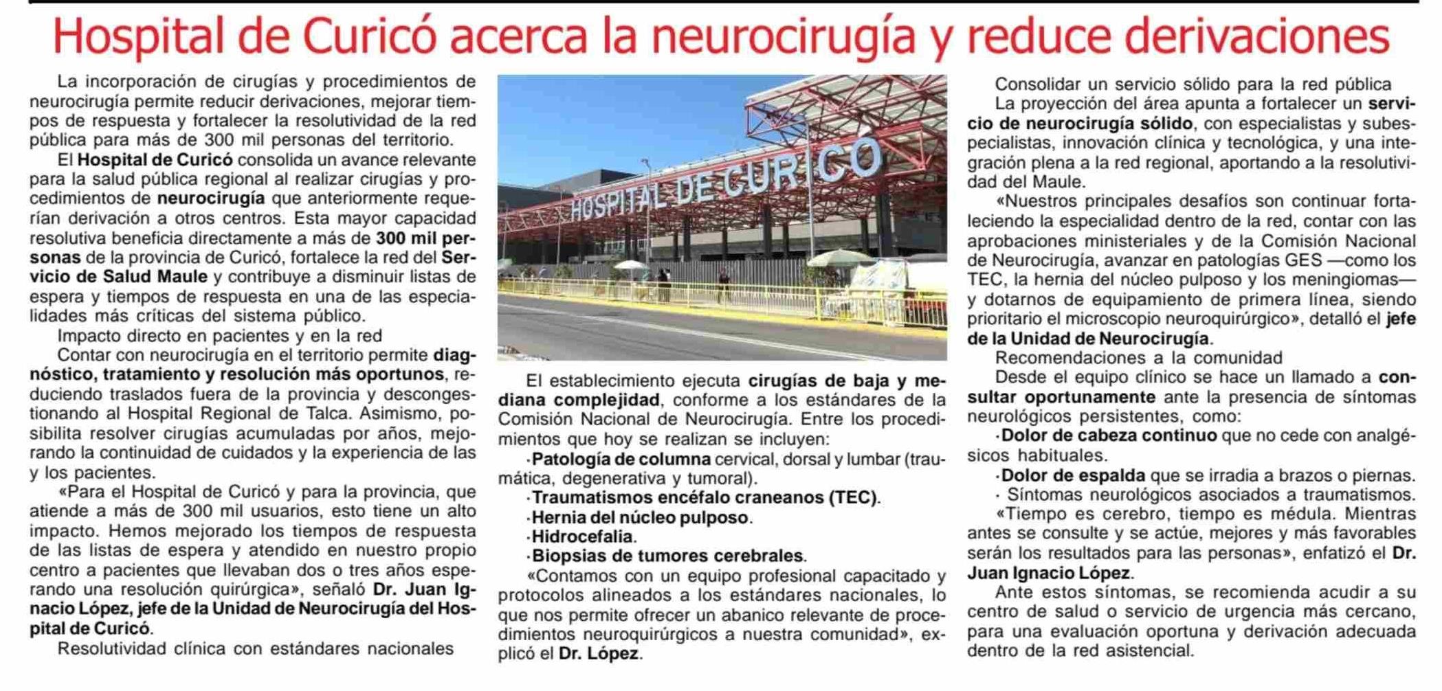 Hospital de Curicó acerca la neurocirugía y
