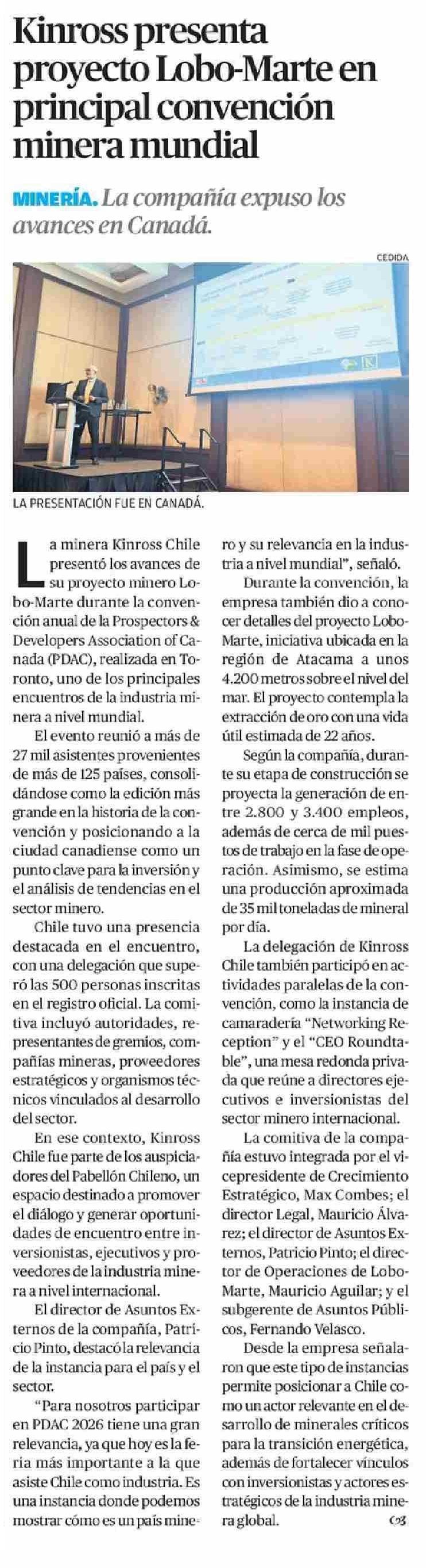 Kinross presenta proyecto Lobo-Marte en principal convención minera mundial