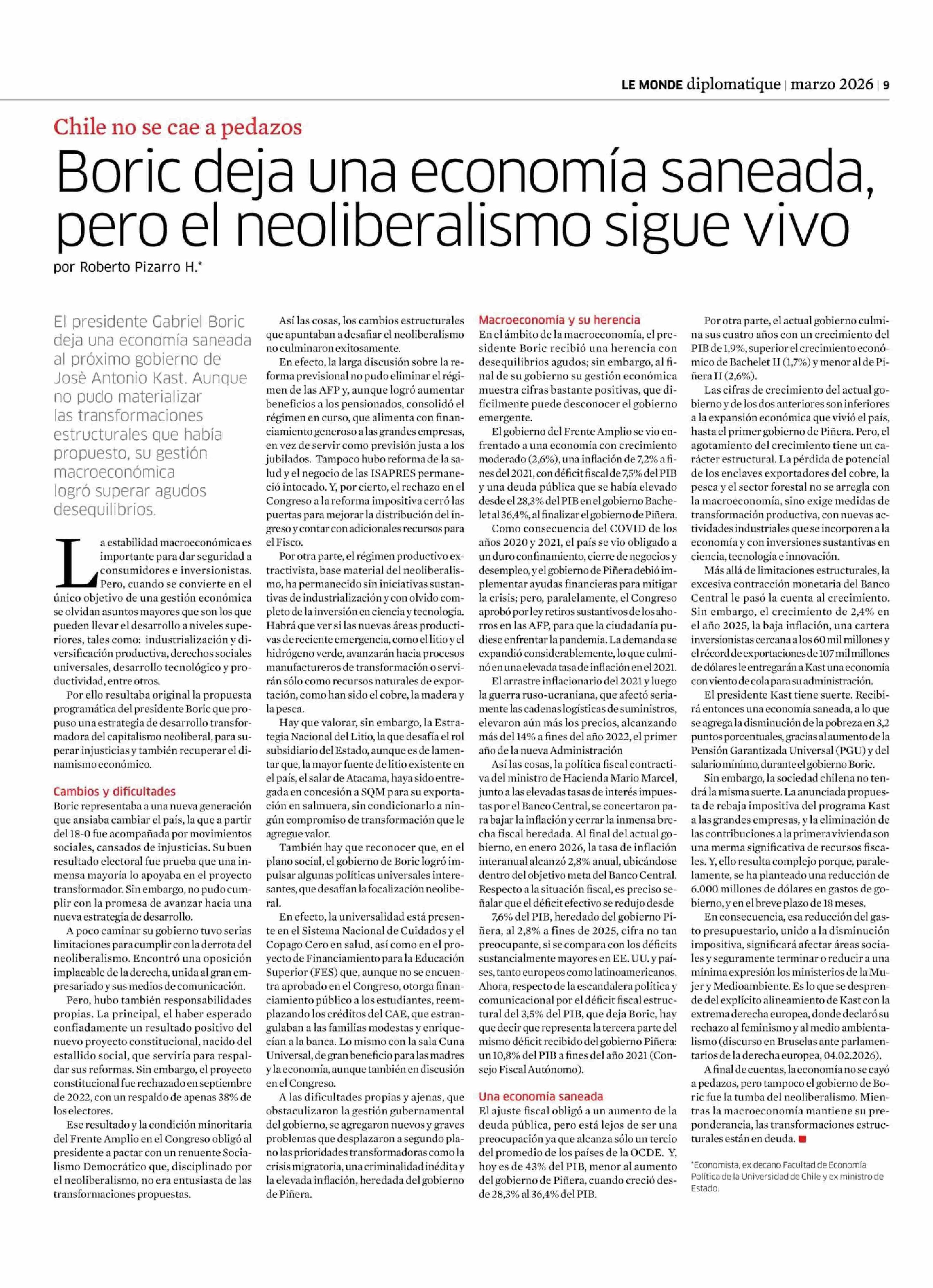 Boric deja una economía saneada, el neoliberalismo sigue vivo