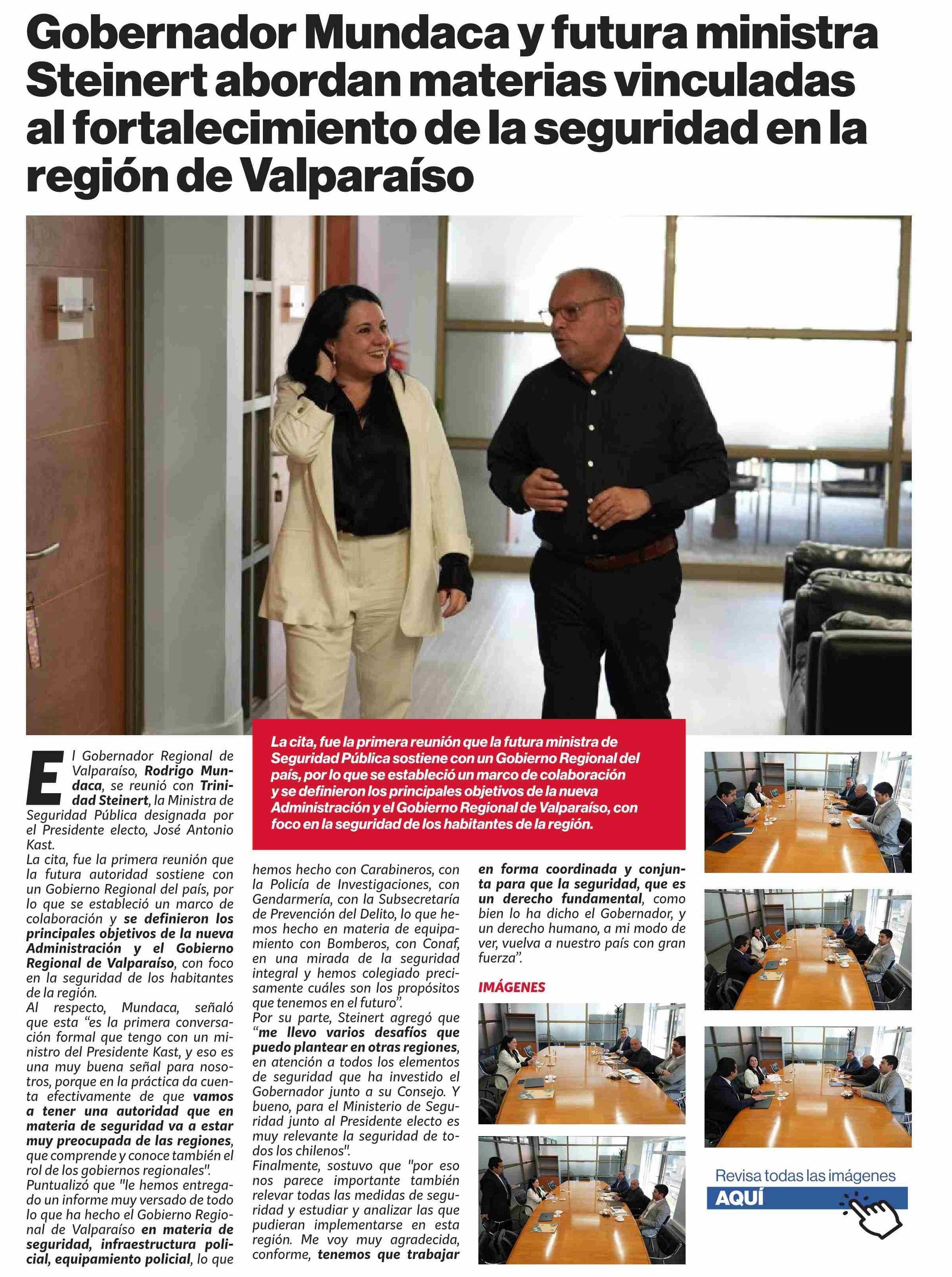 Gobernador Mundaca y futura ministra Steinert abordan materias vinculadas al fortalecimiento de la seguridad en la región de Valparaíso