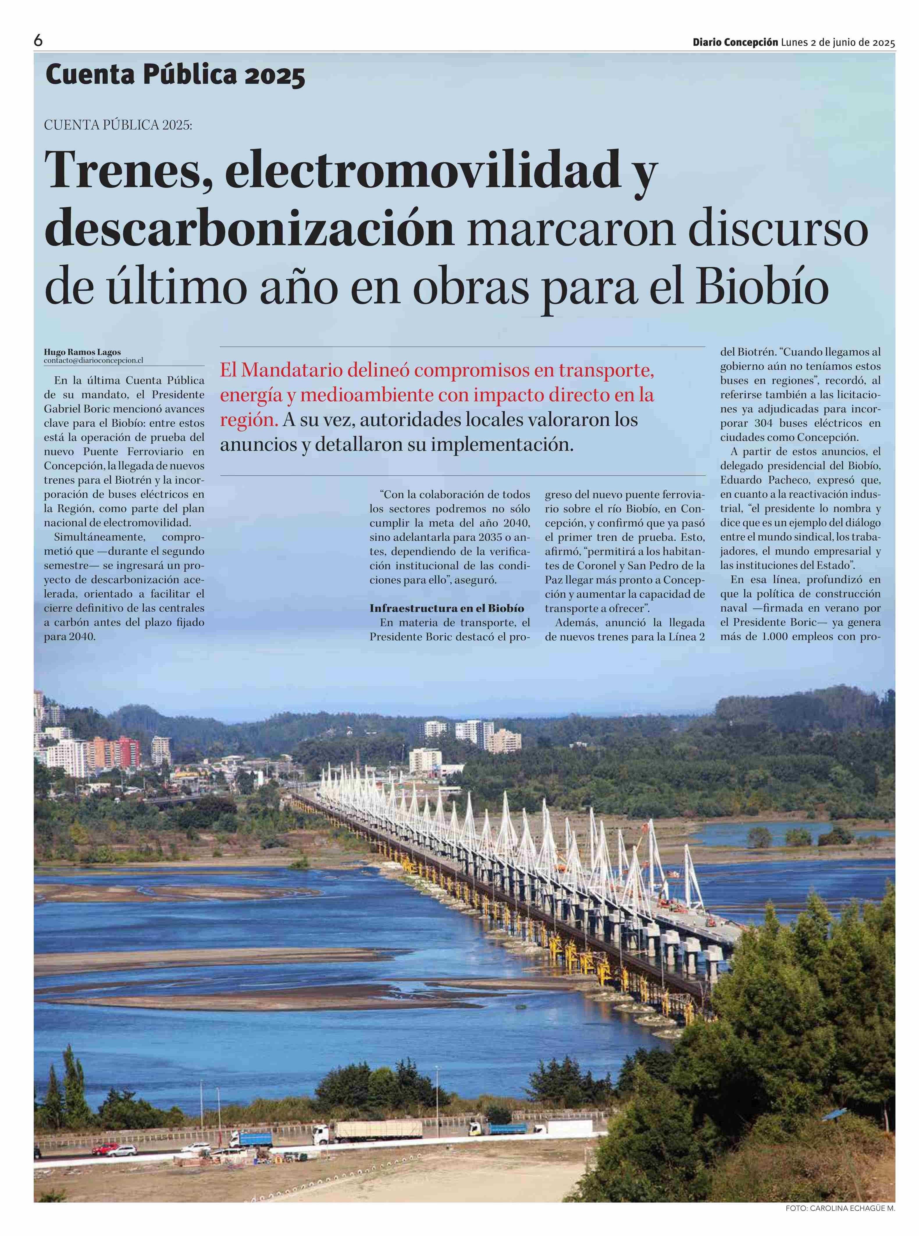 Trenes, electromovilidad y descarbonización marcaron discurso de último año en obras para el Biobío