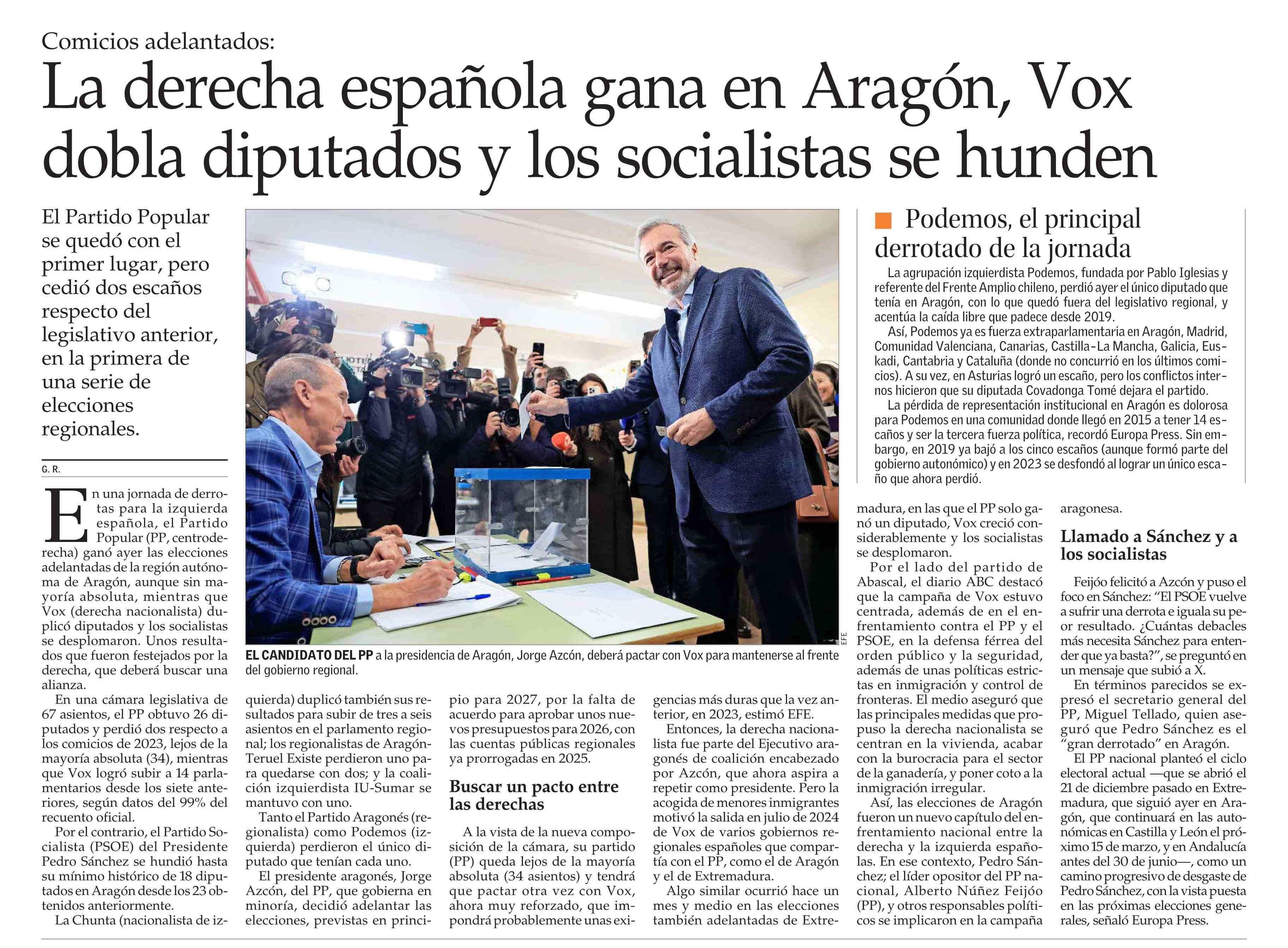 La derecha española gana en Aragón, Vox dobla diputados y los socialistas se hunden
