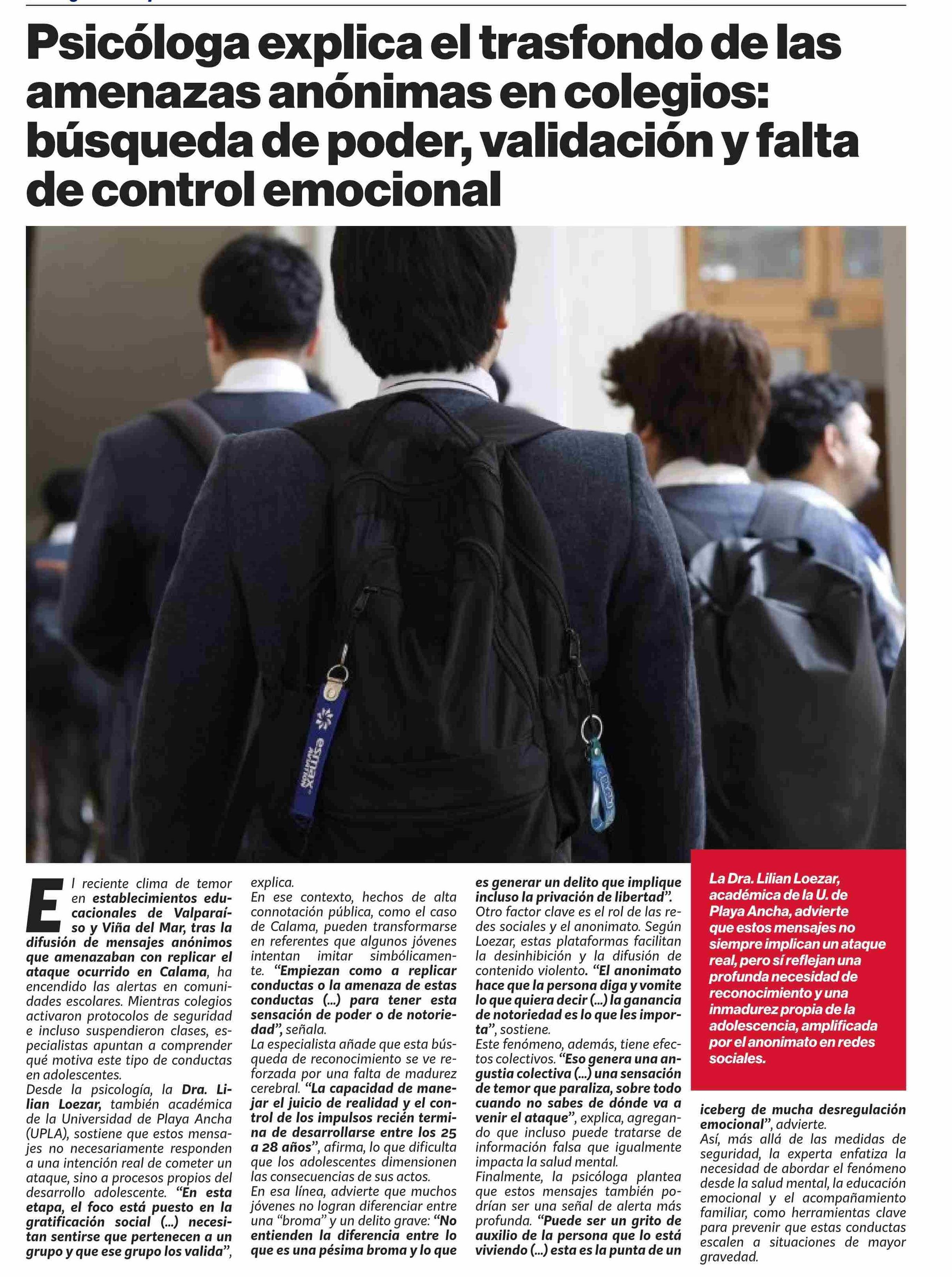 Título: Psicóloga explica el trasfondo de las amenazas anónimas en colegios: búsqueda de poder, validación y falta de control emocional