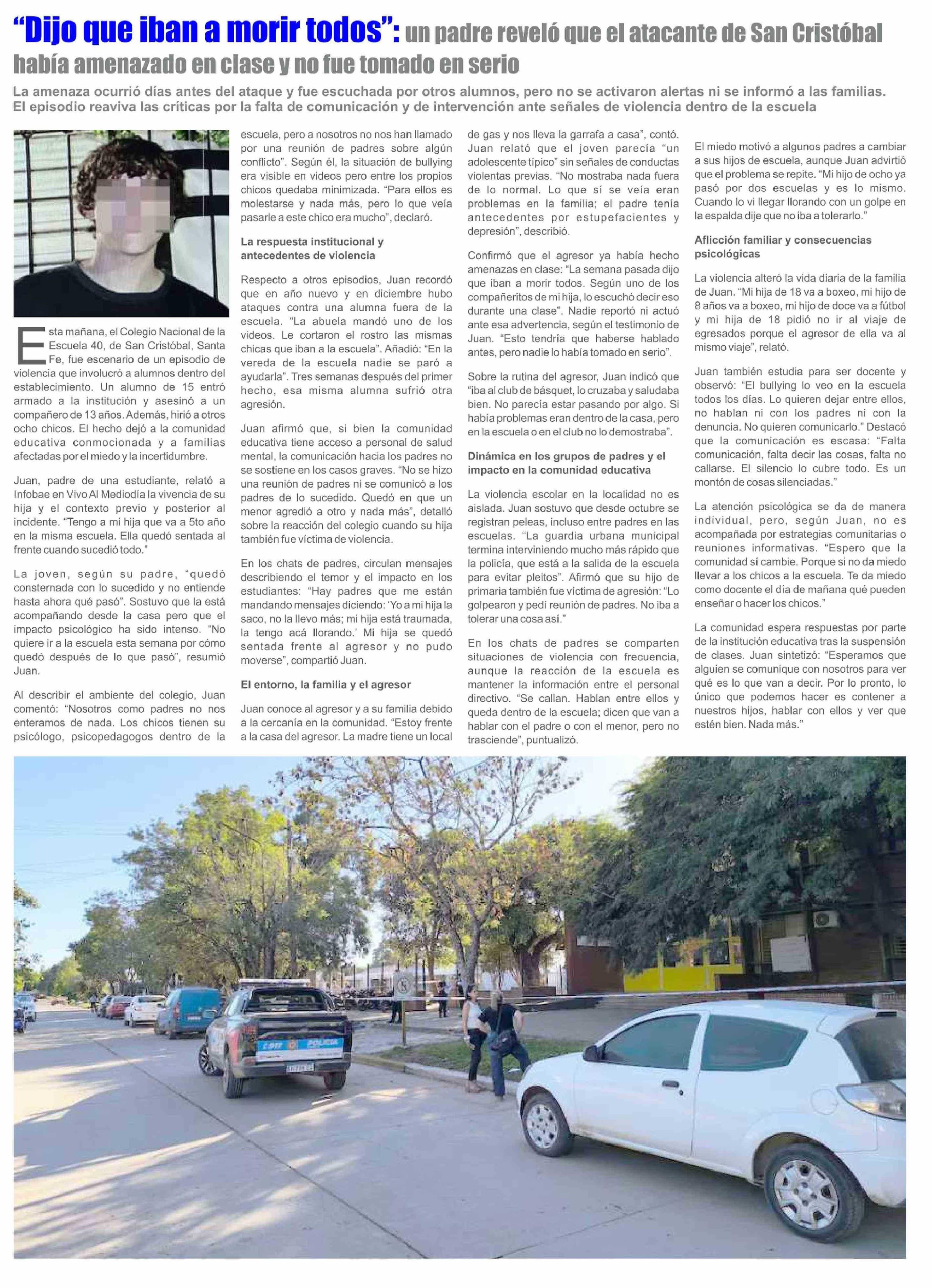"Dijo que iban a morir todos": un padre reveló que el atacante de San Cristóbal había amenazado en clase y no fue tomado en serio