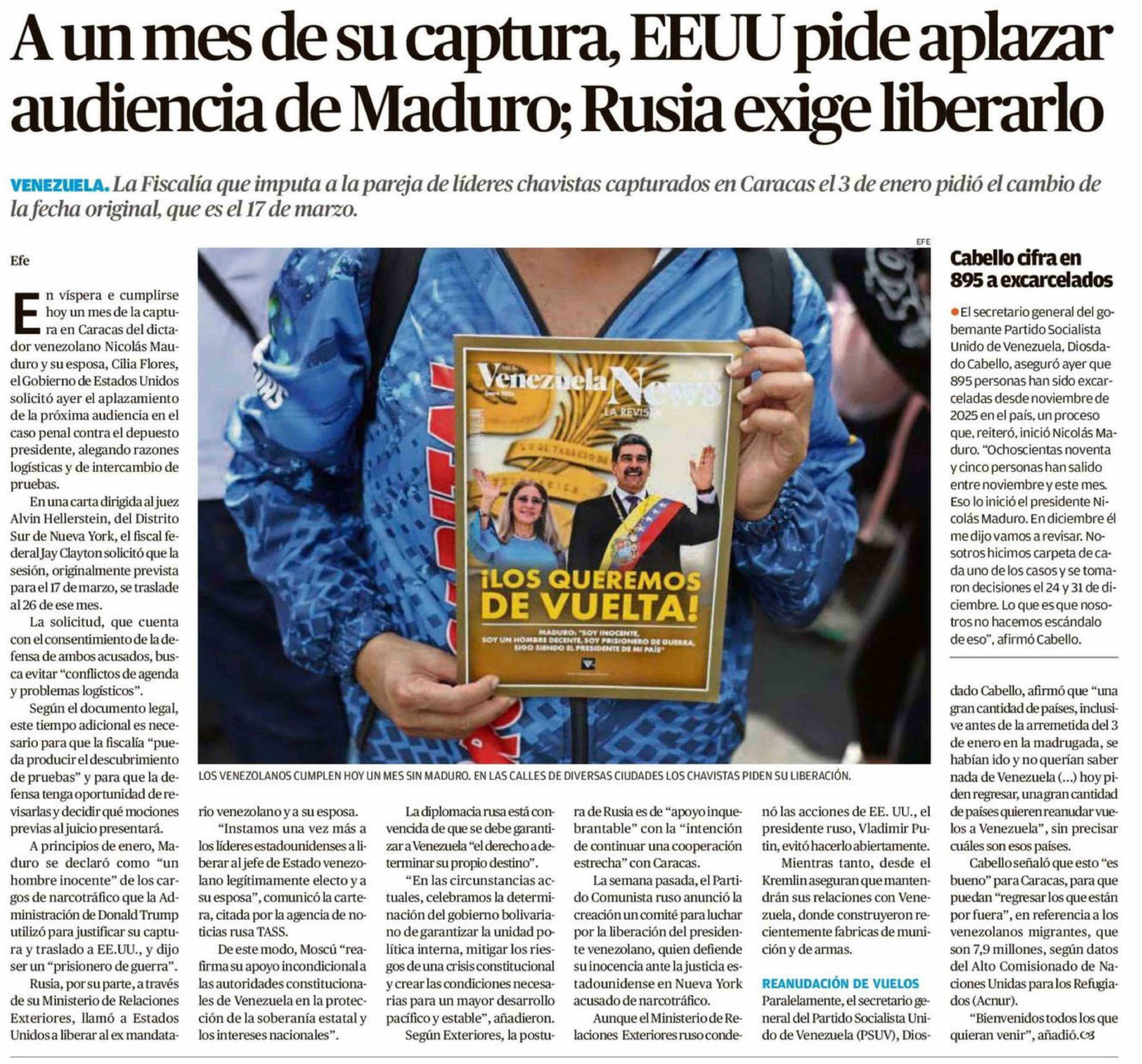 A un mes de su captura, EEUU pide aplazar audiencia de Maduro; Rusia exige liberarlo