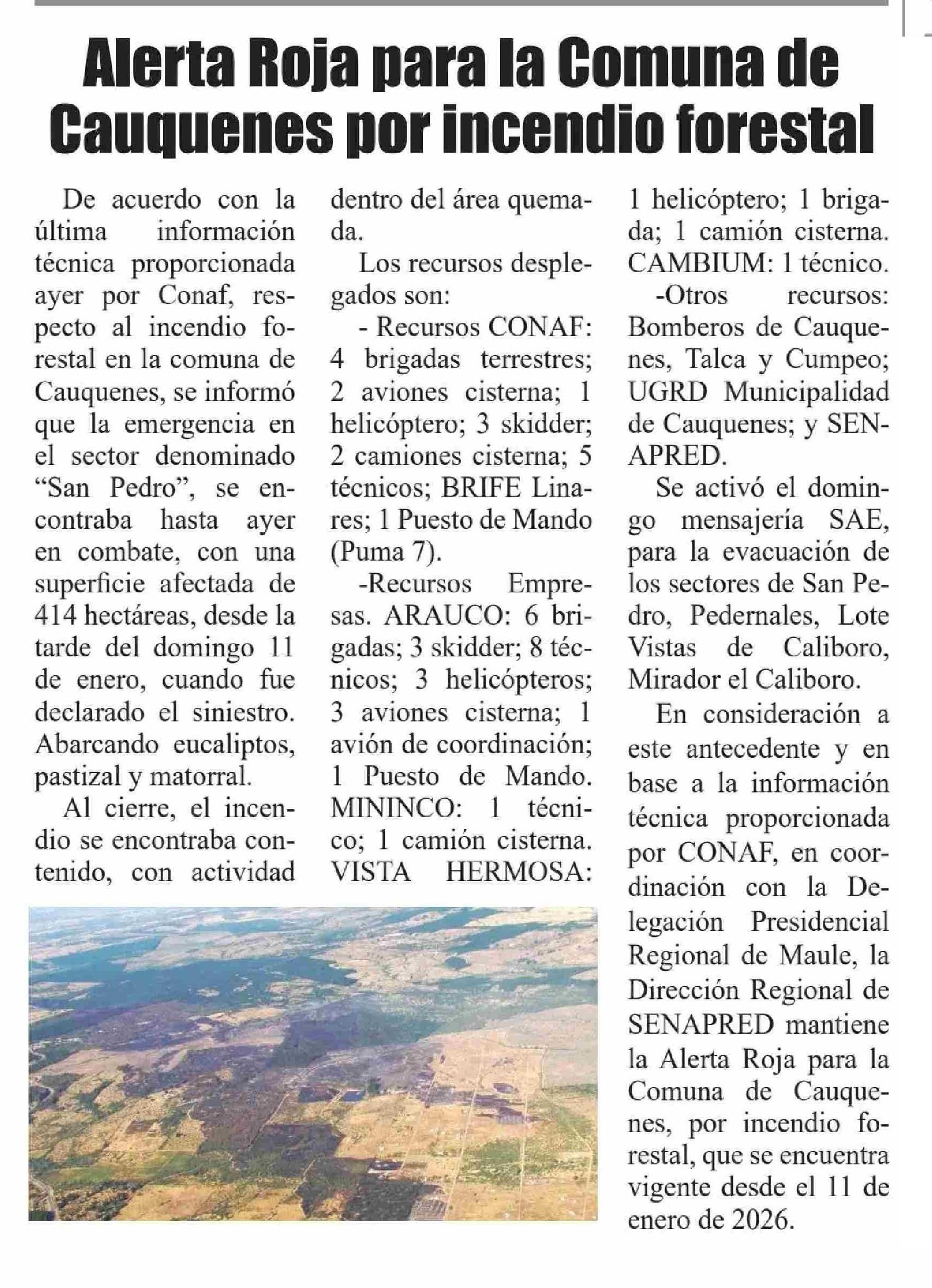 Alerta Roja para la Comuna de Cauquenes por incendio forestal