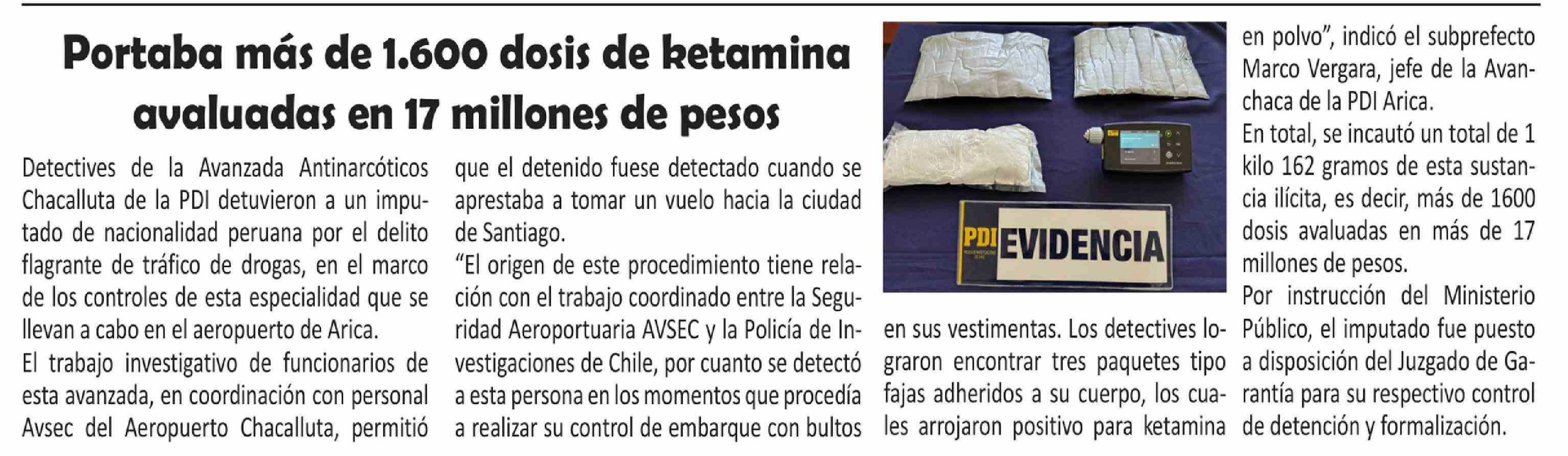 Portaba más de 1.600 dosis de ketamina avaluadas en 17 millones de pesos