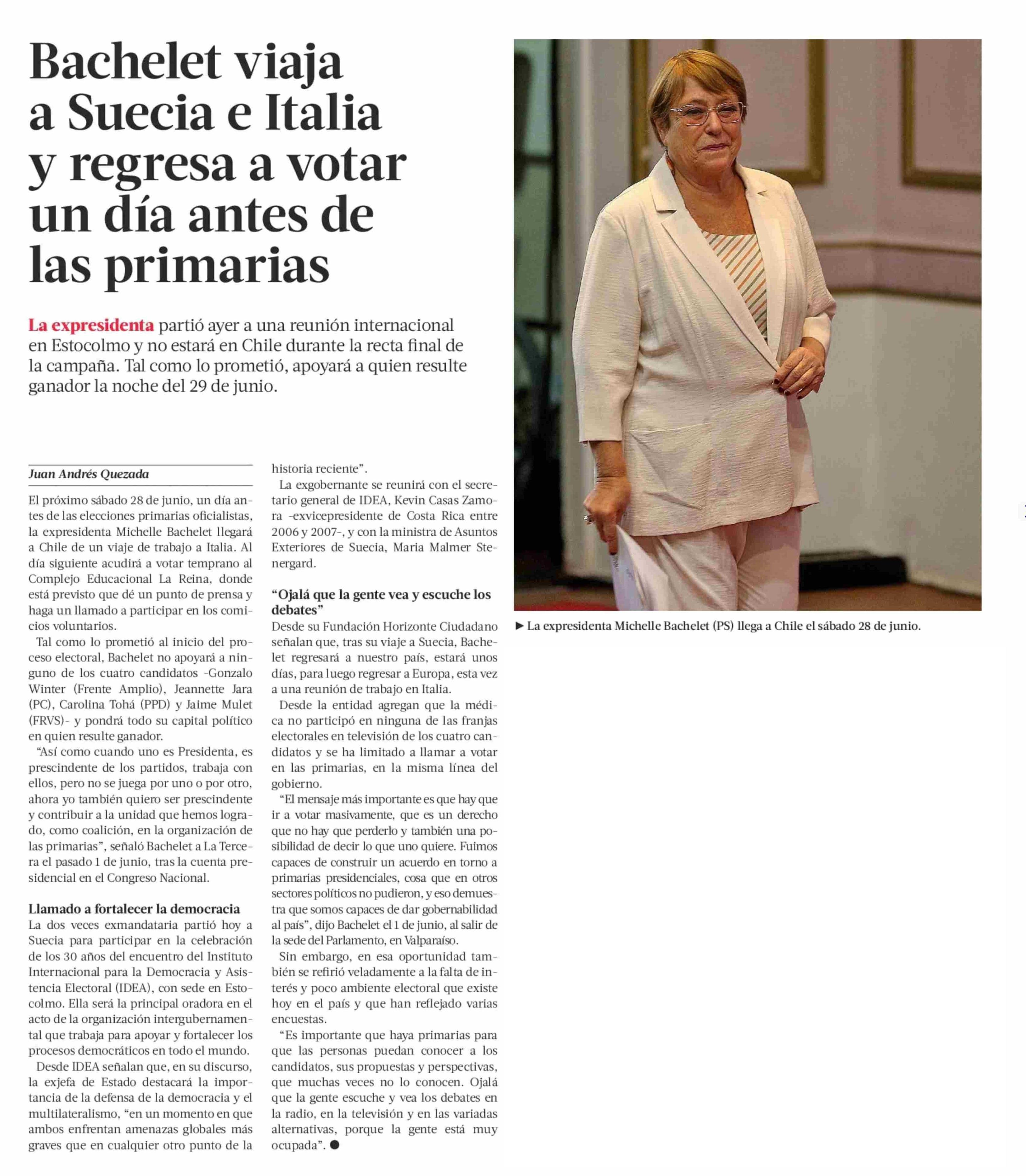 Bachelet viaja a Suecia e Italia y regresa a votar un día antes de las primarias