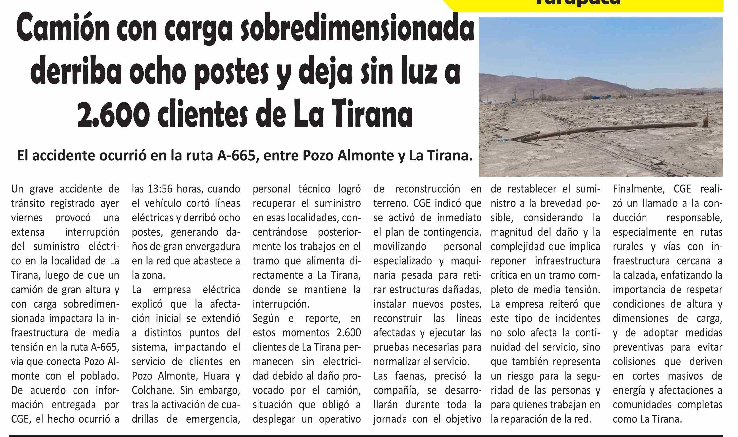 Camión con carga sobredimensionada derriba ocho postes y deja sin luz a 2.600 clientes de La Tirana