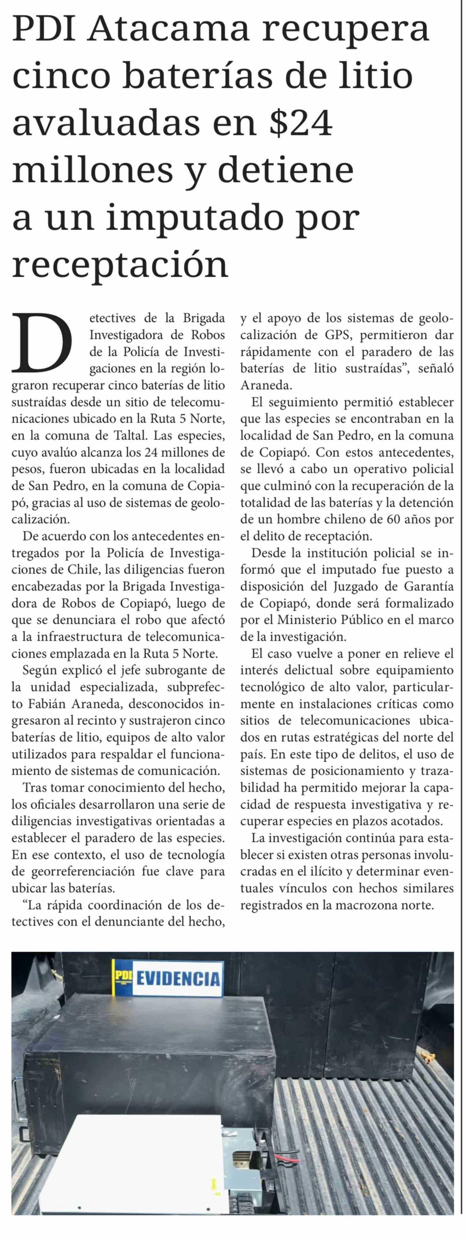 PDI Atacama recupera cinco baterías de litio avaluadas en $24 millones y detiene a un imputado por receptación