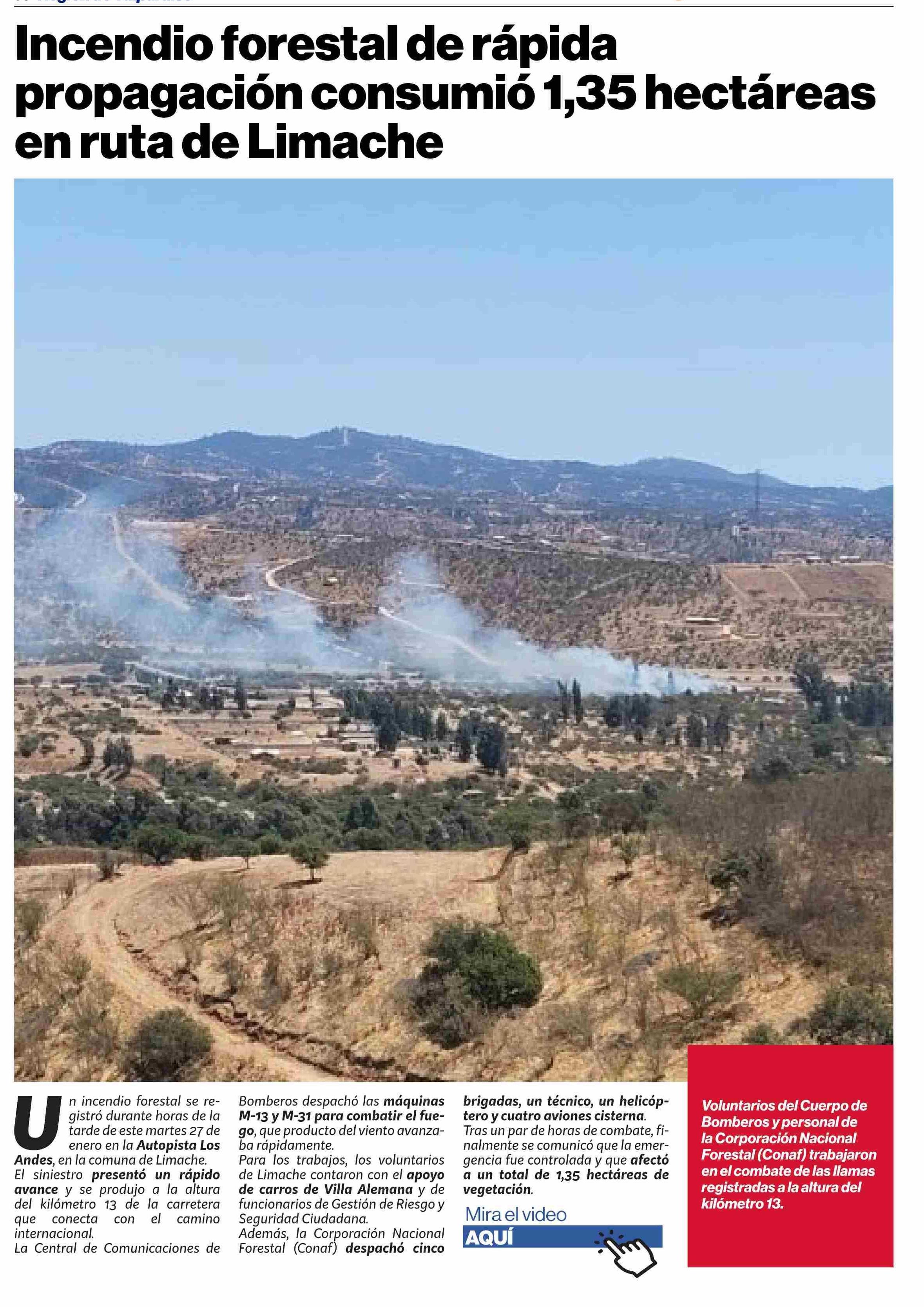 Incendio forestal de rápida propagación consumió 1,35 hectáreas en ruta de Limache