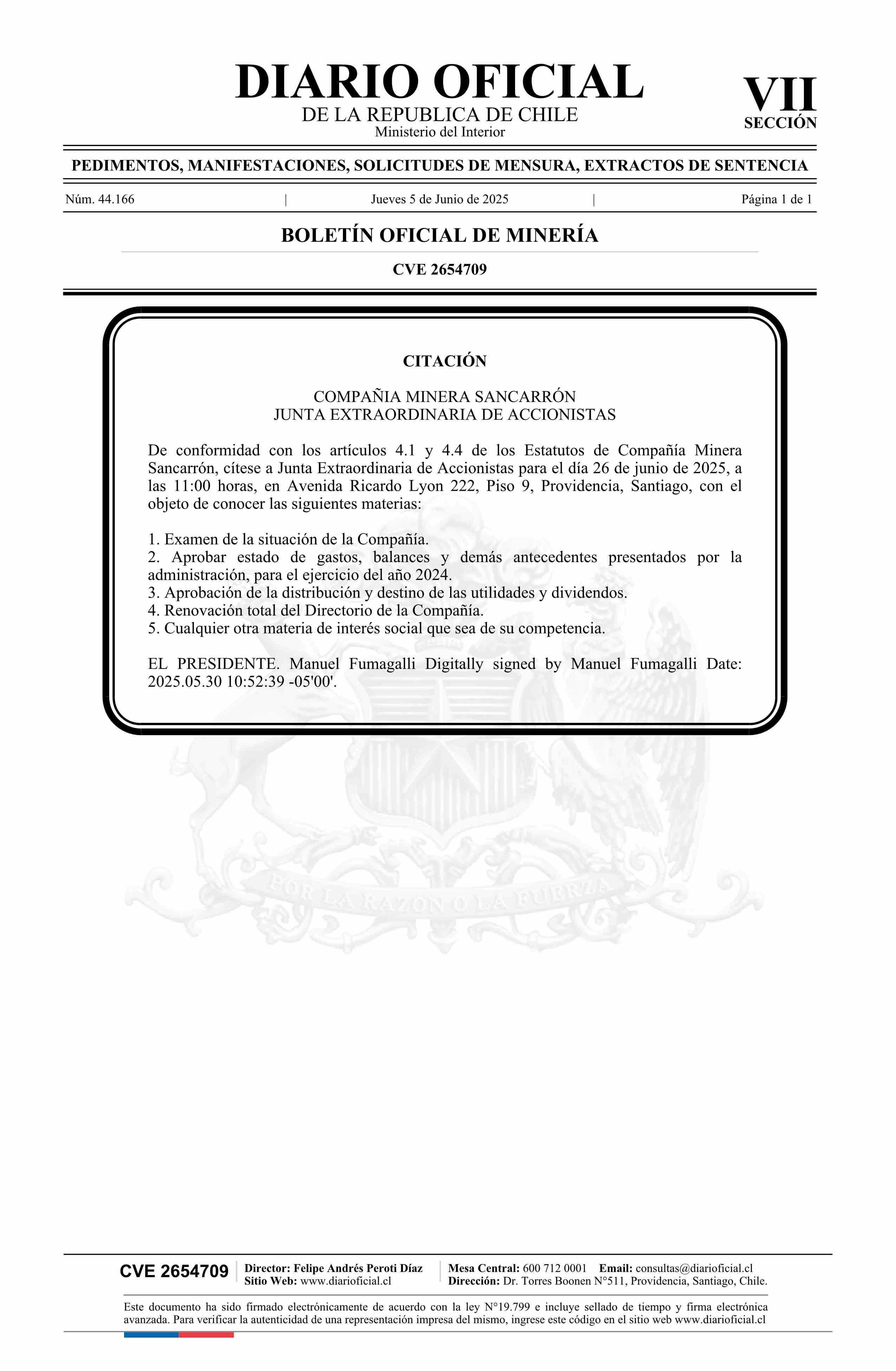DIARIO OFICIAL CHILE - BOLETÍN OFICIAL DE MINERÍA (DIARIO OFICIAL CHILE – BOM – CITACIONES A JUNTA)